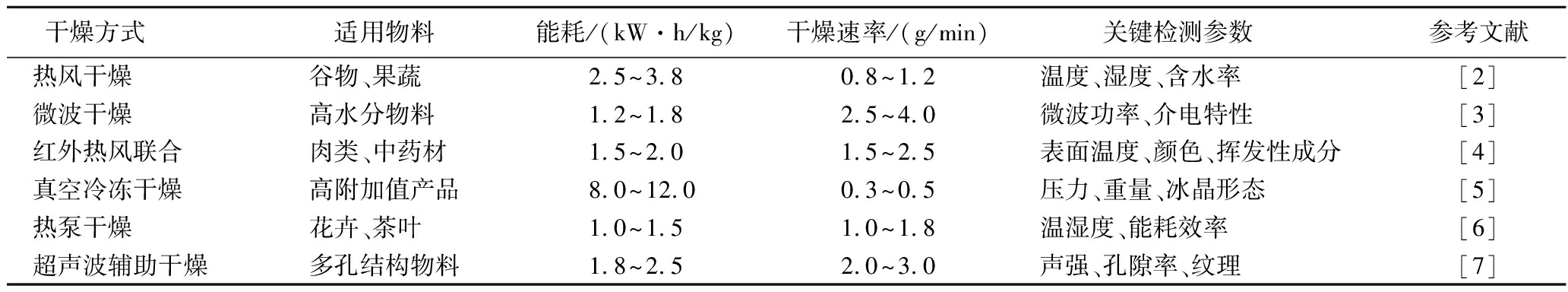检测目标作物干燥方式作用参考文献温湿度海参红外热风检测温度误差[42]花生微波热风控制启停[43]香草红外热风测量不同点温度[44]湿毛巾红外热泵数据采集[45]鲜面条红外热风调节控制[46]压力 猕猴桃冰温真空压力检测[47]空载真空冷冻真空泄漏率检测[48]甘露醇水真空冷冻提供算法参数[49]重量 香蕉片真空冷冻单点称重[50]褐煤红外热风控制结束节点[51]人参超声波热泵计算含水率[42]