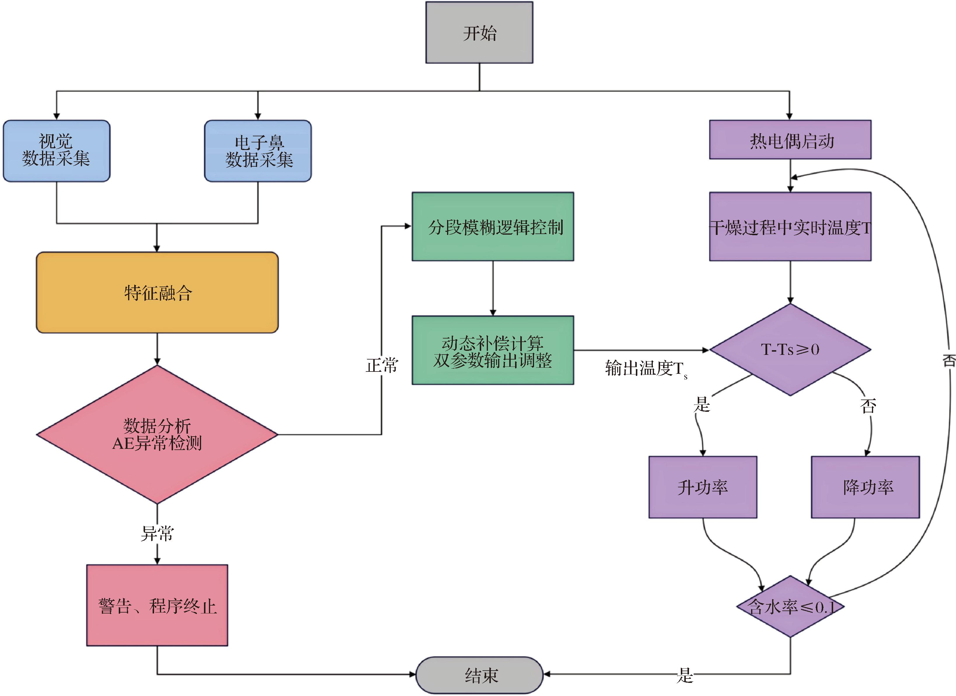利用多源信息融合技术通过整合两类数据的互补性,构建多维特征空间,可以显著提升干燥过程监测的鲁棒性和预测模型的泛化能力,模型精度通过决定系数(coefficient of determination,R2)衡量,其值越接近1表示预测性能越优。宁文楷[58]在南瓜微波干燥研究中,采用分段多参数模糊控制系统流程如图5所示,将视觉技术和电子鼻技术融合建立了多源信息融合模型,经过实验分析和验证,基于极限学习机、偏最小二乘回归和BP神经网络的多源融合模型对含水率、体积密度和β-胡萝卜素的预测精度(R2分别为0.975 8~0.985 7、0.986 1~0.992 6和0.985 0~0.987 4)较单源模型(视觉模型R2为0.970 4~0.984 3,电子鼻模型R2为0.753 5~0.947 8)显著提升,表明融合技术能有效消除冗余信息并增强特征关联性。
