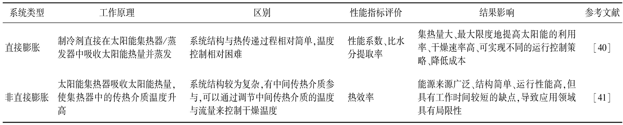 系统类型工作原理区别性能指标评价结果影响参考文献直接膨胀 制冷剂直接在太阳能集热器/蒸发器中吸收太阳能热量并蒸发系统结构与热传递过程相对简单,温度控制相对困难性能系数、比水分提取率集热量大、最大限度地提高太阳能的利用率、干燥速率高、可实现不同的运行控制策略、降低成本[40]非直接膨胀太阳能集热器吸收太阳能热量,使集热器中的传热介质温度升高系统结构较为复杂,有中间传热介质参与,可以通过调节中间传热介质的温度与流量来控制干燥温度热效率能源来源广泛、结构简单、运行性能高,但具有工作时间较短的缺点,导致应用领域具有局限性[41]