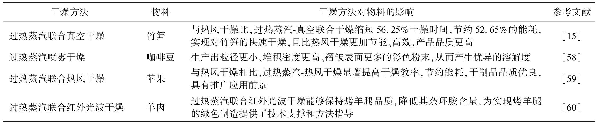 干燥方法物料干燥方法对物料的影响参考文献过热蒸汽联合真空干燥竹笋 与热风干燥比,过热蒸汽-真空联合干燥缩短56.25%干燥时间,节约52.65%的能耗,实现对竹笋的快速干燥,且比热风干燥更加节能、高效,产品品质更高[15]过热蒸汽喷雾干燥咖啡豆生产出粒径更小、堆积密度更高、褶皱表面更多的彩色粉末,从而产生优异的溶解度[58]过热蒸汽联合热风干燥苹果 与热风干燥相比,过热蒸汽-热风干燥显著提高干燥效率,节约能耗,干制品品质优良,具有推广应用前景[59]过热蒸汽联合红外光波干燥羊肉 过热蒸汽联合红外光波干燥能够保持烤羊腿品质,降低其杂环胺含量,为实现烤羊腿的绿色制造提供了技术支撑和方法指导[60]