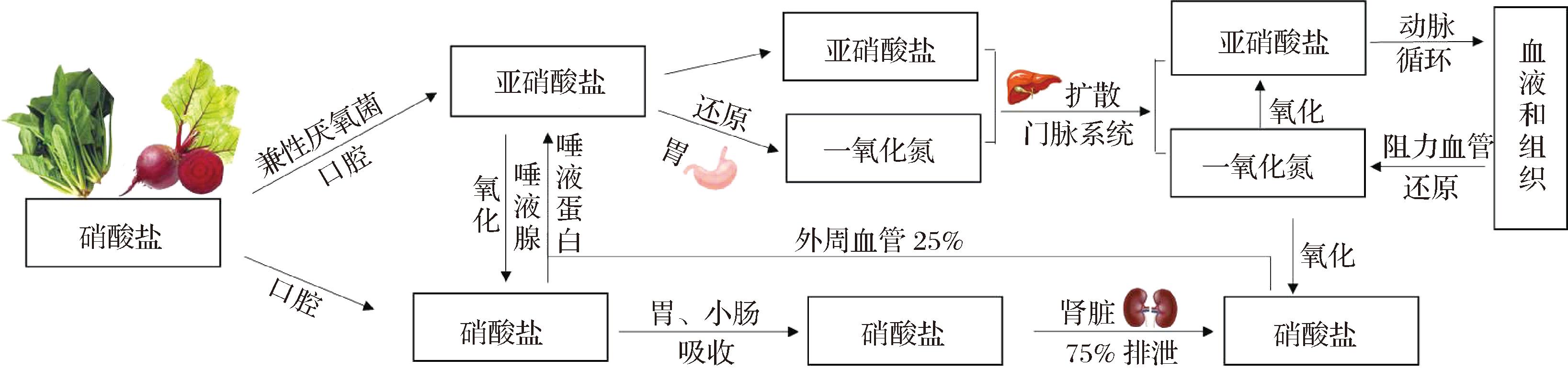 硝酸盐广泛存在于土壤、空气、植物和水资源中[1],是人类膳食中普遍存在的一种分子,本身无毒,但其代谢物会引起高铁血红蛋白血症和肠源性紫绀症,甚至形成强致癌物N-亚硝胺,长期被推测为“致癌”的限量摄入物质[2-4],使消费者过分担忧其安全性而忽视了其生物功能。近年来,学者们发现膳食硝酸盐可通过硝酸盐-亚硝酸盐-一氧化氮途径为人体补充硝酸盐,具有降低血压、抑制血小板聚集、保护血管,提高运动员的运动能力、延缓疲劳发生等生理功能[5-8]。人类摄入的硝酸盐约80%来自于蔬菜,15%来自于饮用水、动物产品(肉、奶酪、鱼类),5%来自于谷物[5-6]。日常饮食中摄入的硝酸盐被认为是潜在的心脏保护性成分,在心血管保护方面具有重要意义[8]。然而,蔬菜中的硝酸盐含量因蔬菜类型、土壤条件、化肥、烹饪方式等因素影响差异较大[1,9],导致膳食硝酸盐摄入量的评估及其对人体发挥的生理功能无法得到一致的结论,但膳食硝酸盐对人体的健康益处基本得到了证实。因此,为了清晰阐释膳食硝酸盐对人体的健康益处和安全性,本文综述了膳食硝酸盐的来源及其在人体内的代谢与功能,加工方式对食品中硝酸盐含量的影响与其安全性,以期为消费者合理利用膳食硝酸盐促进人体健康,为企业开发富含硝酸盐的健康食品提供理论依据。