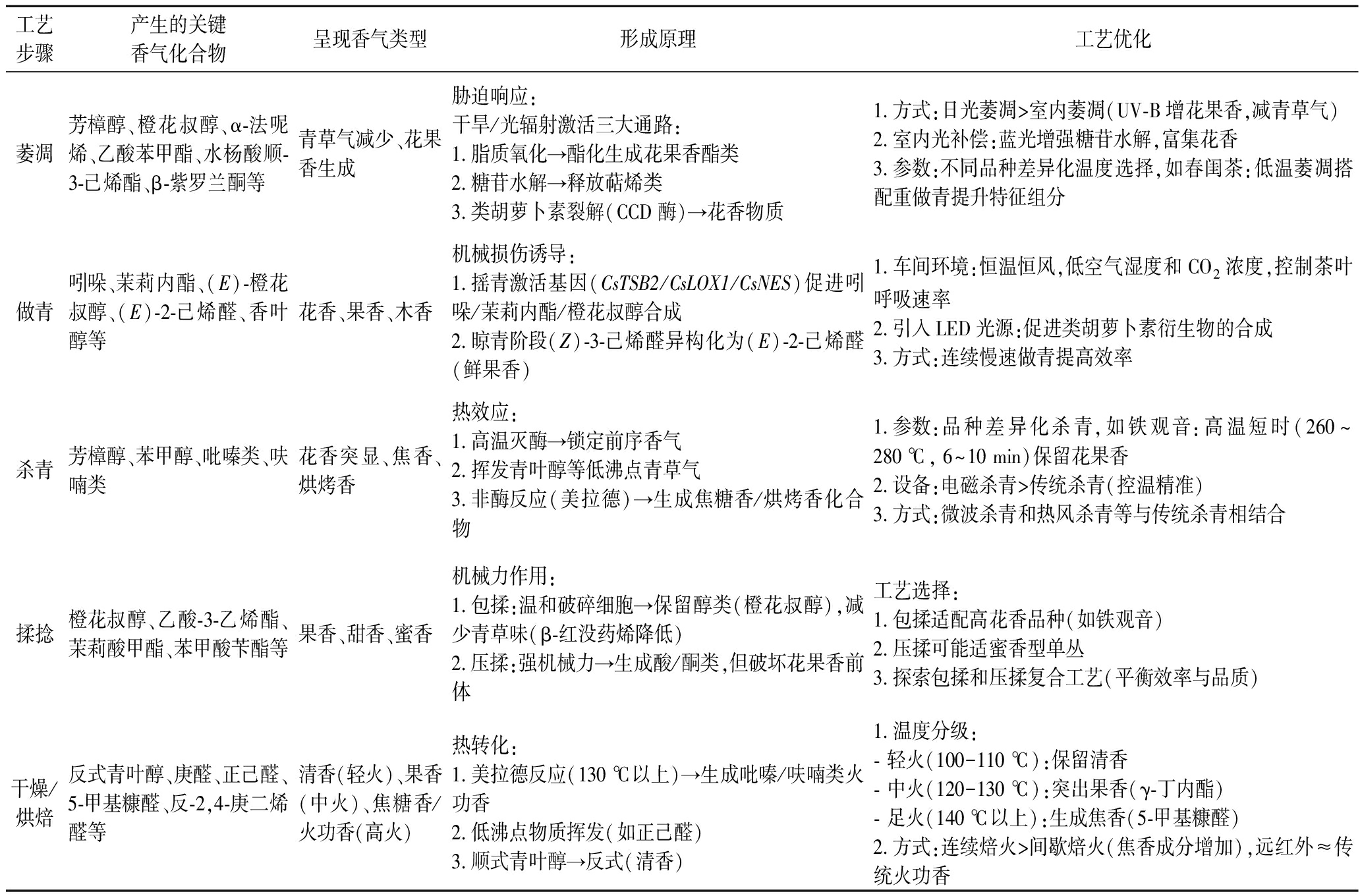 工艺步骤产生的关键香气化合物呈现香气类型形成原理工艺优化萎凋芳樟醇、橙花叔醇、α-法呢烯、乙酸苯甲酯、水杨酸顺-3-己烯酯、β-紫罗兰酮等青草气减少、花果香生成胁迫响应:干旱/光辐射激活三大通路:1.脂质氧化→酯化生成花果香酯类2.糖苷水解→释放萜烯类3.类胡萝卜素裂解(CCD酶)→花香物质1.方式:日光萎凋>室内萎凋(UV-B增花果香,减青草气)2.室内光补偿:蓝光增强糖苷水解,富集花香3.参数:不同品种差异化温度选择,如春闺茶:低温萎凋搭配重做青提升特征组分做青吲哚、茉莉内酯、(E)-橙花叔醇、(E)-2-己烯醛、香叶醇等花香、果香、木香机械损伤诱导:1.摇青激活基因(CsTSB2/CsLOX1/CsNES)促进吲哚/茉莉内酯/橙花叔醇合成2.晾青阶段(Z)-3-己烯醛异构化为(E)-2-己烯醛(鲜果香)1.车间环境:恒温恒风,低空气湿度和CO2浓度,控制茶叶呼吸速率2.引入LED光源:促进类胡萝卜素衍生物的合成3.方式:连续慢速做青提高效率杀青芳樟醇、苯甲醇、吡嗪类、呋喃类花香突显、焦香、烘烤香热效应:1.高温灭酶→锁定前序香气2.挥发青叶醇等低沸点青草气3.非酶反应(美拉德)→生成焦糖香/烘烤香化合物1.参数:品种差异化杀青,如铁观音:高温短时(260~280 ℃, 6~10 min)保留花果香2.设备:电磁杀青>传统杀青(控温精准)3.方式:微波杀青和热风杀青等与传统杀青相结合揉捻橙花叔醇、乙酸-3-乙烯酯、茉莉酸甲酯、苯甲酸苄酯等果香、甜香、蜜香机械力作用:1.包揉:温和破碎细胞→保留醇类(橙花叔醇),减少青草味(β-红没药烯降低)2.压揉:强机械力→生成酸/酮类,但破坏花果香前体工艺选择:1.包揉适配高花香品种(如铁观音)2.压揉可能适蜜香型单丛3.探索包揉和压揉复合工艺(平衡效率与品质)干燥/烘焙反式青叶醇、庚醛、正己醛、5-甲基糠醛、反-2,4-庚二烯醛等清香(轻火)、果香(中火)、焦糖香/火功香(高火)热转化:1.美拉德反应(130 ℃以上)→生成吡嗪/呋喃类火功香2.低沸点物质挥发(如正己醛)3.顺式青叶醇→反式(清香)1.温度分级:- 轻火(100-110 ℃):保留清香- 中火(120-130 ℃):突出果香(γ-丁内酯)- 足火(140 ℃以上):生成焦香(5-甲基糠醛)2.方式:连续焙火>间歇焙火(焦香成分增加),远红外≈传统火功香