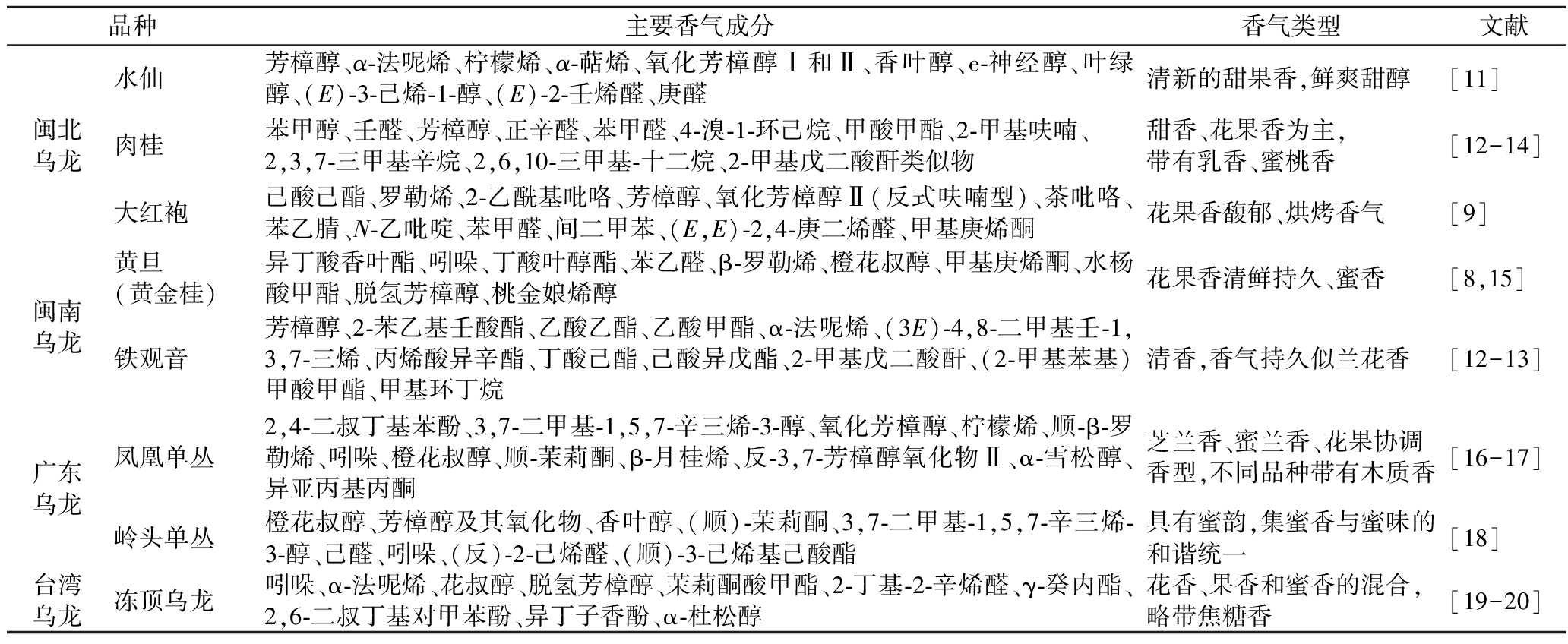 品种主要香气成分香气类型文献闽北乌龙水仙芳樟醇、α-法呢烯、柠檬烯、α-萜烯、氧化芳樟醇Ⅰ和Ⅱ、香叶醇、e-神经醇、叶绿醇、(E)-3-己烯-1-醇、(E)-2-壬烯醛、庚醛清新的甜果香,鲜爽甜醇[11]肉桂苯甲醇、壬醛、芳樟醇、正辛醛、苯甲醛、4-溴-1-环己烷、甲酸甲酯、2-甲基呋喃、2,3,7-三甲基辛烷、2,6,10-三甲基-十二烷、2-甲基戊二酸酐类似物甜香、花果香为主,带有乳香、蜜桃香[12-14]大红袍己酸己酯、罗勒烯、2-乙酰基吡咯、芳樟醇、氧化芳樟醇Ⅱ(反式呋喃型)、茶吡咯、苯乙腈、N-乙吡啶、苯甲醛、间二甲苯、(E,E)-2,4-庚二烯醛、甲基庚烯酮花果香馥郁、烘烤香气[9]闽南乌龙黄旦(黄金桂)异丁酸香叶酯、吲哚、丁酸叶醇酯、苯乙醛、β-罗勒烯、橙花叔醇、甲基庚烯酮、水杨酸甲酯、脱氢芳樟醇、桃金娘烯醇花果香清鲜持久、蜜香[8,15]铁观音芳樟醇、2-苯乙基壬酸酯、乙酸乙酯、乙酸甲酯、α-法呢烯、(3E)-4,8-二甲基壬-1,3,7-三烯、丙烯酸异辛酯、丁酸己酯、己酸异戊酯、2-甲基戊二酸酐、(2-甲基苯基)甲酸甲酯、甲基环丁烷清香,香气持久似兰花香[12-13]广东乌龙凤凰单丛2,4-二叔丁基苯酚、3,7-二甲基-1,5,7-辛三烯-3-醇、氧化芳樟醇、柠檬烯、顺-β-罗勒烯、吲哚、橙花叔醇、顺-茉莉酮、β-月桂烯、反-3,7-芳樟醇氧化物Ⅱ、α-雪松醇、异亚丙基丙酮芝兰香、蜜兰香、花果协调香型,不同品种带有木质香[16-17]岭头单丛橙花叔醇、芳樟醇及其氧化物、香叶醇、(顺)-茉莉酮、3,7-二甲基-1,5,7-辛三烯-3-醇、己醛、吲哚、(反)-2-己烯醛、(顺)-3-己烯基己酸酯具有蜜韵,集蜜香与蜜味的和谐统一[18]台湾乌龙冻顶乌龙吲哚、α-法呢烯、花叔醇、脱氢芳樟醇、茉莉酮酸甲酯、2-丁基-2-辛烯醛、γ-癸内酯、2,6-二叔丁基对甲苯酚、异丁子香酚、α-杜松醇花香、果香和蜜香的混合,略带焦糖香[19-20]