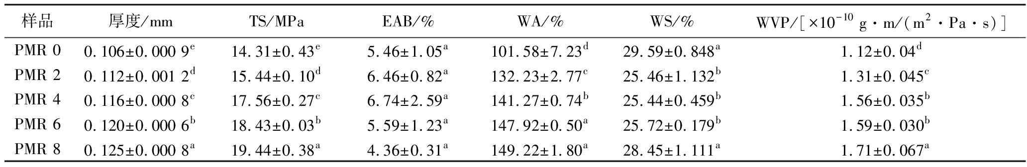 样品厚度/mmTS/MPaEAB/%WA/%WS/%WVP/[×10-10 g·m/(m2·Pa·s)]PMR 00.106±0.000 9e14.31±0.43e5.46±1.05a101.58±7.23d29.59±0.848a1.12±0.04dPMR 20.112±0.001 2d15.44±0.10d6.46±0.82a132.23±2.77c25.46±1.132b1.31±0.045cPMR 40.116±0.000 8c17.56±0.27c6.74±2.59a141.27±0.74b25.44±0.459b1.56±0.035bPMR 60.120±0.000 6b18.43±0.03b5.59±1.23a147.92±0.50a25.72±0.179b1.59±0.030bPMR 80.125±0.000 8a19.44±0.38a4.36±0.31a149.22±1.80a28.45±1.111a1.71±0.067a