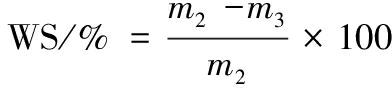 耐水性能测定:将指示膜裁成3 cm×3 cm的正方形样条,记录初始质量m0(g),取50 mL去离子水,在25 ℃下将指示膜浸于去离子水中,静置12 h,取出用滤纸吸干表面水分,称重m1(g)。将指示膜裁成2 cm×2 cm的正方形,取50 mL蒸馏水,记录初始质量m2(g),在室温下将指示膜浸于烧杯中,静置12 h,机械搅拌2 h,过滤,将滤渣干燥至恒重,称重m3(g)重复测定3次,使用公式(1)、公式(2)分别计算薄膜的吸水率(water absorption,WA)和水溶解性(water solubility,WS):