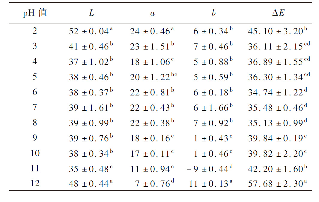 pH值LabΔE252±0.04a24±0.46a6±0.34b45.10±3.20b341±0.46b23±1.51b7±0.46b36.11±2.15cd437±1.02b18±1.06c5±0.88b36.89±1.55cd538±0.46b20±1.22bc5±0.59b36.30±1.34cd638±0.37b22±0.81b6±0.18b34.74±1.22d739±1.61b22±0.43b6±1.66b35.48±0.46d839±0.99b22±0.38b7±0.92b35.13±0.99d939±0.76b18±0.16c1±0.43c39.84±0.19c1038±0.34b17±0.11c1±0.46c39.82±2.20c1135±0.48c11±0.94c-9±0.44d42.20±1.60b1248±0.44a7±0.76d11±0.13a57.68±2.30a