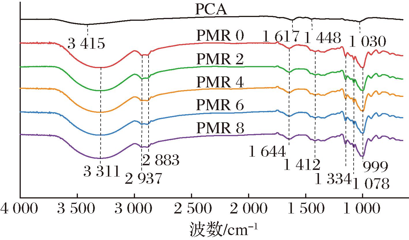 C键的拉伸振动有关[2],随着PCA质量浓度增加,此处峰强度增大,这是由于PCA与水分子之间结合能力较强,同时也导致高浓度膜的WA增加。1 412、1 334 cm-1被认为是—CH的伸缩振动[2]。1 078、1 030 cm-1处吸收峰与C—O—C的拉伸振动有关[2],而999 cm-1处的峰对应于PS分子中葡萄糖残基的特征吡喃糖环[14]。加入PCA后,PCA在3 415、1 448 cm-1处的峰值分别红移至3 311、1 412 cm-1处,主要由于PCA与PS、MCC之间形成新的分子间作用力,发生了静电吸引。以上结果表明PCA与PS、MCC分子之间结合紧密,且未产生新的基团。