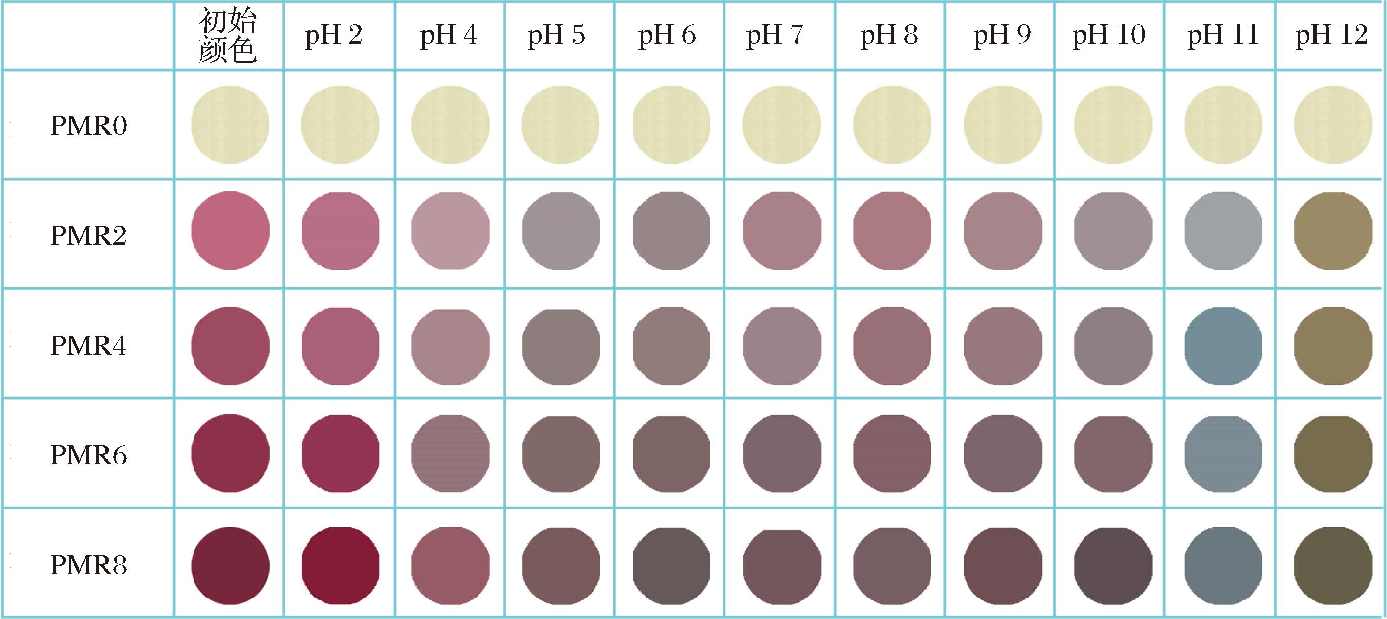图4展示了不同质量浓度PCA的指示膜在pH值为2~12下的颜色响应。由图4可知,指示膜的颜色随着缓冲液的pH值从深红色(pH 2~4)转变为浅红色(pH 5~6)到紫色(pH 7~8)到蓝色(pH 9~11)再到黄绿色(pH 12)。这些变化主要是由于花青素结构的变化引起的[20]。当pH值为2~3时,花青素为红色的黄酮阳离子结构。当pH值在4~5时,黄酮阳离子由于羟基的去质子化而转化为无色的甲醇假碱,红色减淡。当pH值为6~7时,黄酮阳离子进一步去质子化形成奎宁样酸和碱,并伴有变为紫色,而在pH值为7~10时,蓝色阴离子醌在溶液中占主导地位,在pH>11时,蓝色醌碱与黄色查酮反应,导致颜色呈蓝绿色/变暗。PMR 4和PMR 6指示膜均表现出较为明显的pH敏感性。同时,表3列出了PMR 6指示膜在不同pH值下大于5的ΔE值。综合前文结果可得,PMR 6指示膜具备应用潜力。