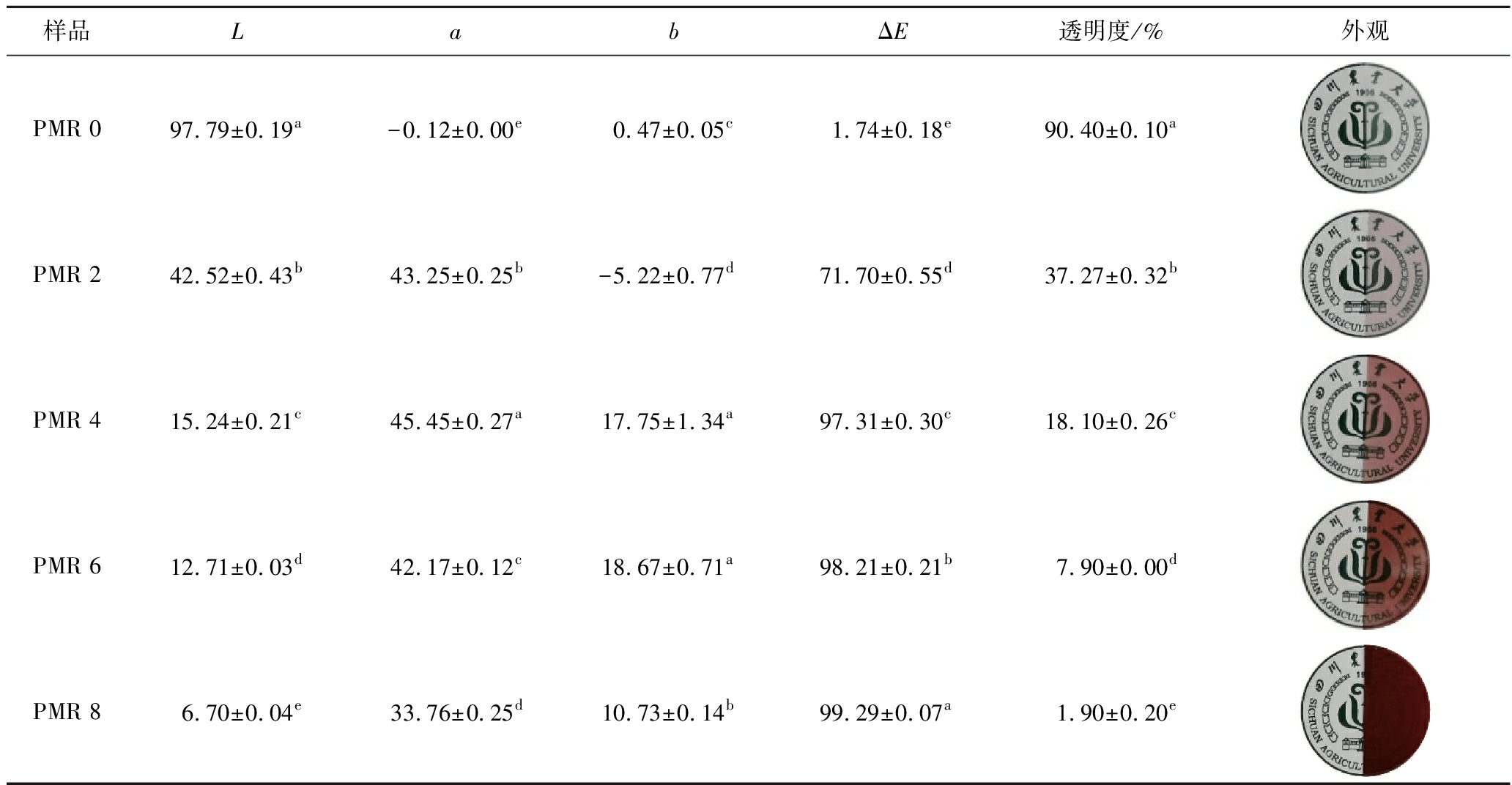 样品LabΔE透明度/%外观PMR 097.79±0.19a-0.12±0.00e0.47±0.05c1.74±0.18e90.40±0.10aPMR 242.52±0.43b43.25±0.25b-5.22±0.77d71.70±0.55d37.27±0.32bPMR 415.24±0.21c45.45±0.27a17.75±1.34a97.31±0.30c18.10±0.26cPMR 612.71±0.03d42.17±0.12c18.67±0.71a98.21±0.21b7.90±0.00dPMR 86.70±0.04e33.76±0.25d10.73±0.14b99.29±0.07a1.90±0.20e