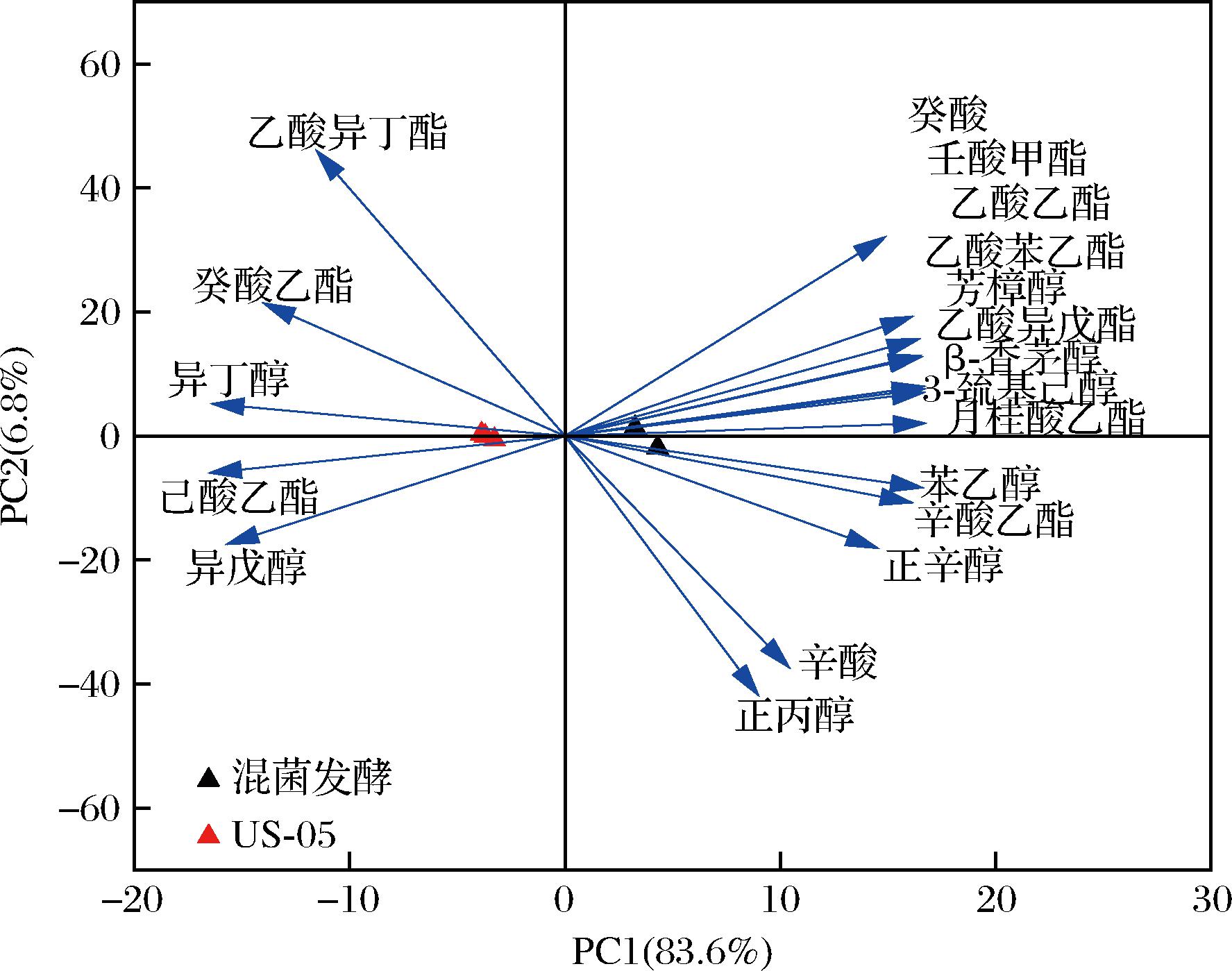 在混菌发酵的啤酒中检测到3MH,其质量浓度为144.09 ng/L,OAV为2.40,与US-05单独发酵相比提高了70.28%。有研究指出酒花中10%~20%的硫醇是以结合态形式存在,需要β-裂解酶的催化将其释放,这也表明M3产生的β-裂解酶对于酒花中硫醇物质的释放有积极作用。进一步对啤酒中21种主要挥发性化合物作主成分分析,结果如图3所示,样品相距越远说明差异越大。结果显示混菌发酵工艺与3MH、芳樟醇、β-香茅醇、乙酸乙酯、乙酸苯乙酯、月桂酸乙酯、辛酸乙酯和苯乙醇的形成有很强的相关性,这几种物质对啤酒的香气特别是柑橘类、花香等有重要的贡献。