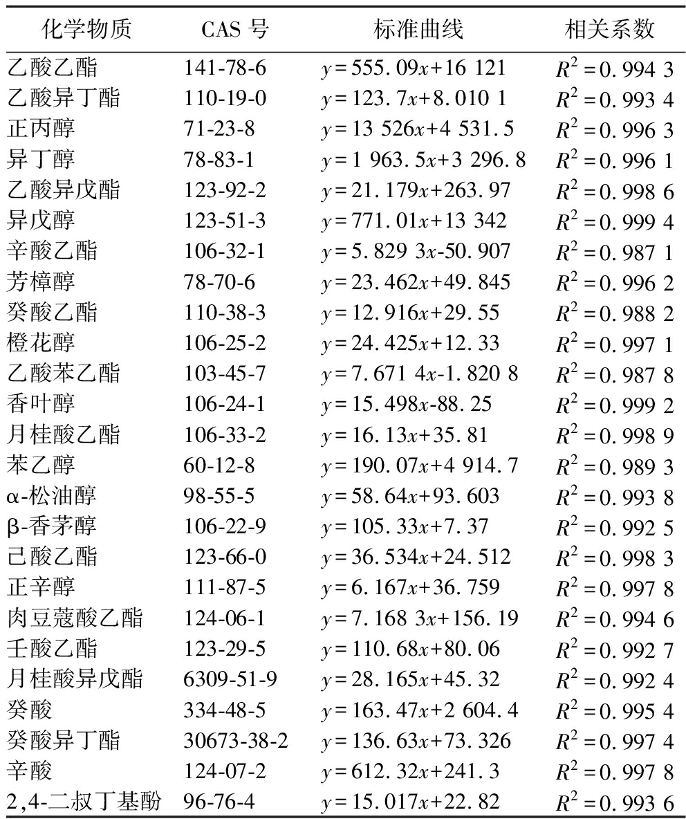 化学物质CAS号标准曲线相关系数乙酸乙酯141-78-6y=555.09x+16 121R2=0.994 3乙酸异丁酯110-19-0y=123.7x+8.010 1R2=0.993 4正丙醇71-23-8y=13 526x+4 531.5R2=0.996 3异丁醇78-83-1y=1 963.5x+3 296.8R2=0.996 1乙酸异戊酯123-92-2y=21.179x+263.97R2=0.998 6异戊醇123-51-3y=771.01x+13 342R2=0.999 4辛酸乙酯106-32-1y=5.829 3x-50.907R2=0.987 1芳樟醇78-70-6y=23.462x+49.845R2=0.996 2癸酸乙酯110-38-3y=12.916x+29.55R2=0.988 2橙花醇106-25-2y=24.425x+12.33R2=0.997 1乙酸苯乙酯103-45-7y=7.671 4x-1.820 8R2=0.987 8香叶醇106-24-1y=15.498x-88.25R2=0.999 2月桂酸乙酯106-33-2y=16.13x+35.81R2=0.998 9苯乙醇60-12-8y=190.07x+4 914.7R2=0.989 3α-松油醇98-55-5y=58.64x+93.603R2=0.993 8β-香茅醇106-22-9y=105.33x+7.37R2=0.992 5己酸乙酯123-66-0y=36.534x+24.512R2=0.998 3正辛醇111-87-5y=6.167x+36.759R2=0.997 8肉豆蔻酸乙酯124-06-1y=7.168 3x+156.19R2=0.994 6壬酸乙酯123-29-5y=110.68x+80.06R2=0.992 7月桂酸异戊酯6309-51-9y=28.165x+45.32R2=0.992 4癸酸334-48-5y=163.47x+2 604.4R2=0.995 4癸酸异丁酯30673-38-2y=136.63x+73.326R2=0.997 4辛酸124-07-2y=612.32x+241.3R2=0.997 82,4-二叔丁基酚96-76-4y=15.017x+22.82R2=0.993 6