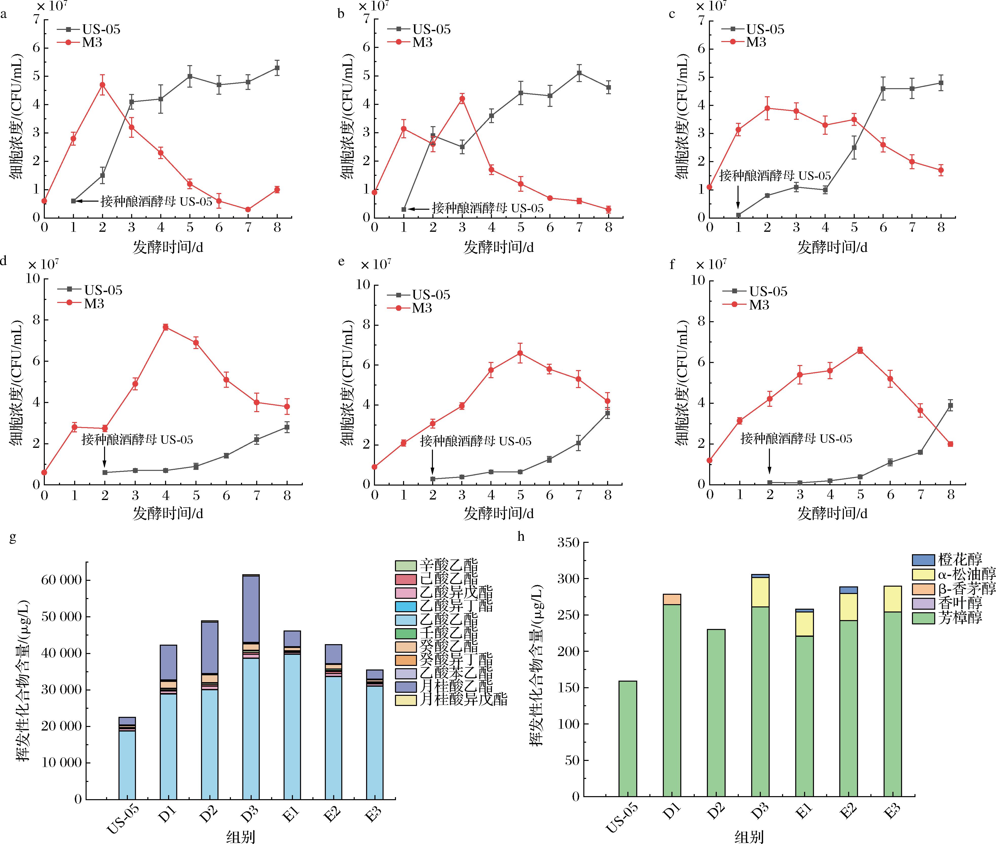 依据2.1.2节的实验结果,间隔接种的发酵温度选择在22 ℃下进行。间隔1 d接种条件下,US-05与M3的细胞浓度与同时接种相比显著下降(P<0.01);间隔2 d接种时,US-05的细胞浓度与单独发酵相比显著降低,M3的生长不受影响(P<0.01)。由图2-a~图2-c可知,未接种US-05时,M3细胞浓度随发酵时间增长,接种US-05后,M3的细胞浓度从第2天或第3天开始下降。乙醇积累以及其他胁迫如营养限制和较低的pH值,可能是与酿酒酵母共发酵时M3活力的降低的主要原因[20]。据报道,酿酒酵母在其细胞表面积累抗菌肽,通过细胞间接触促进了非酵母菌的死亡。间隔2 d接种时US-05迟滞期延长,且酵母增长速率缓慢,主要是由于此时M3已经形成菌种优势,与US-05竞争营养物质从而抑制US-05的生长导致的。间隔接种的发酵周期长于同时接种,发酵时间比同时接种平均延长了4~5 d,可能是由于间隔接种时US-05前期生长受抑制,前期发酵较慢。