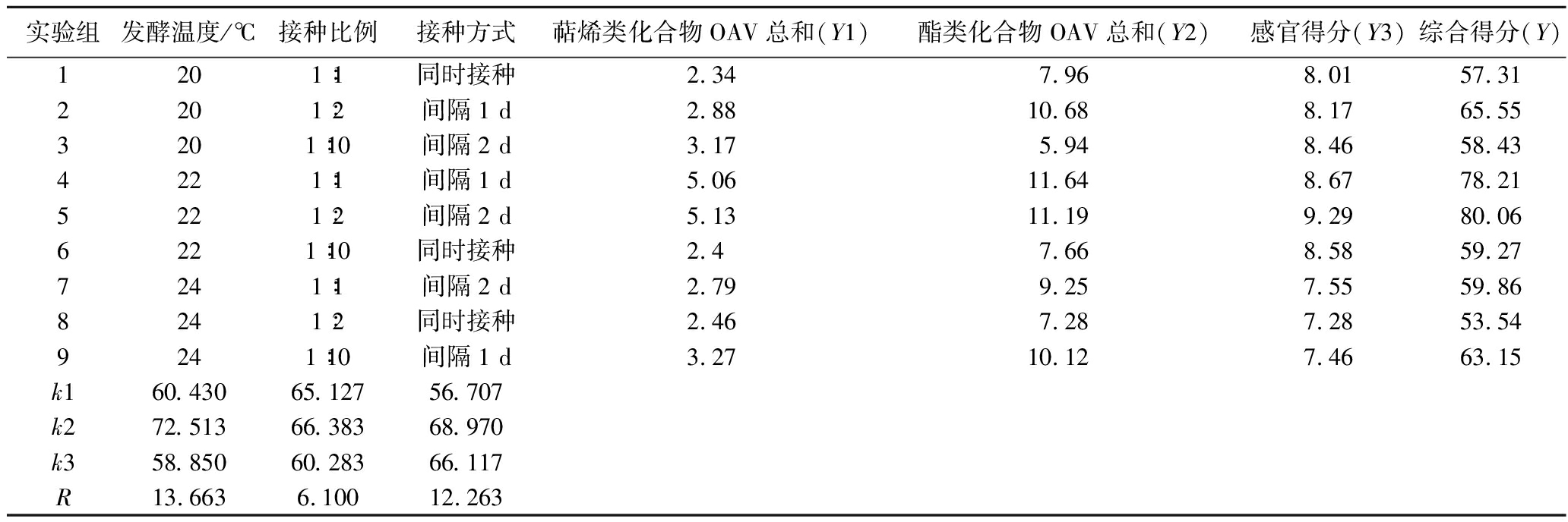 实验组发酵温度/℃接种比例接种方式萜烯类化合物OAV总和(Y1)酯类化合物OAV总和(Y2)感官得分(Y3)综合得分(Y)1201∶1同时接种2.347.968.0157.312201∶2间隔1 d2.8810.688.1765.553201∶10间隔2 d3.175.948.4658.434221∶1间隔1 d5.0611.648.6778.215221∶2间隔2 d5.1311.199.2980.066221∶10同时接种2.47.668.5859.277241∶1间隔2 d2.799.257.5559.868241∶2同时接种2.467.287.2853.549241∶10间隔1 d3.2710.127.4663.15k160.43065.12756.707k272.51366.38368.970k358.85060.28366.117R13.6636.10012.263