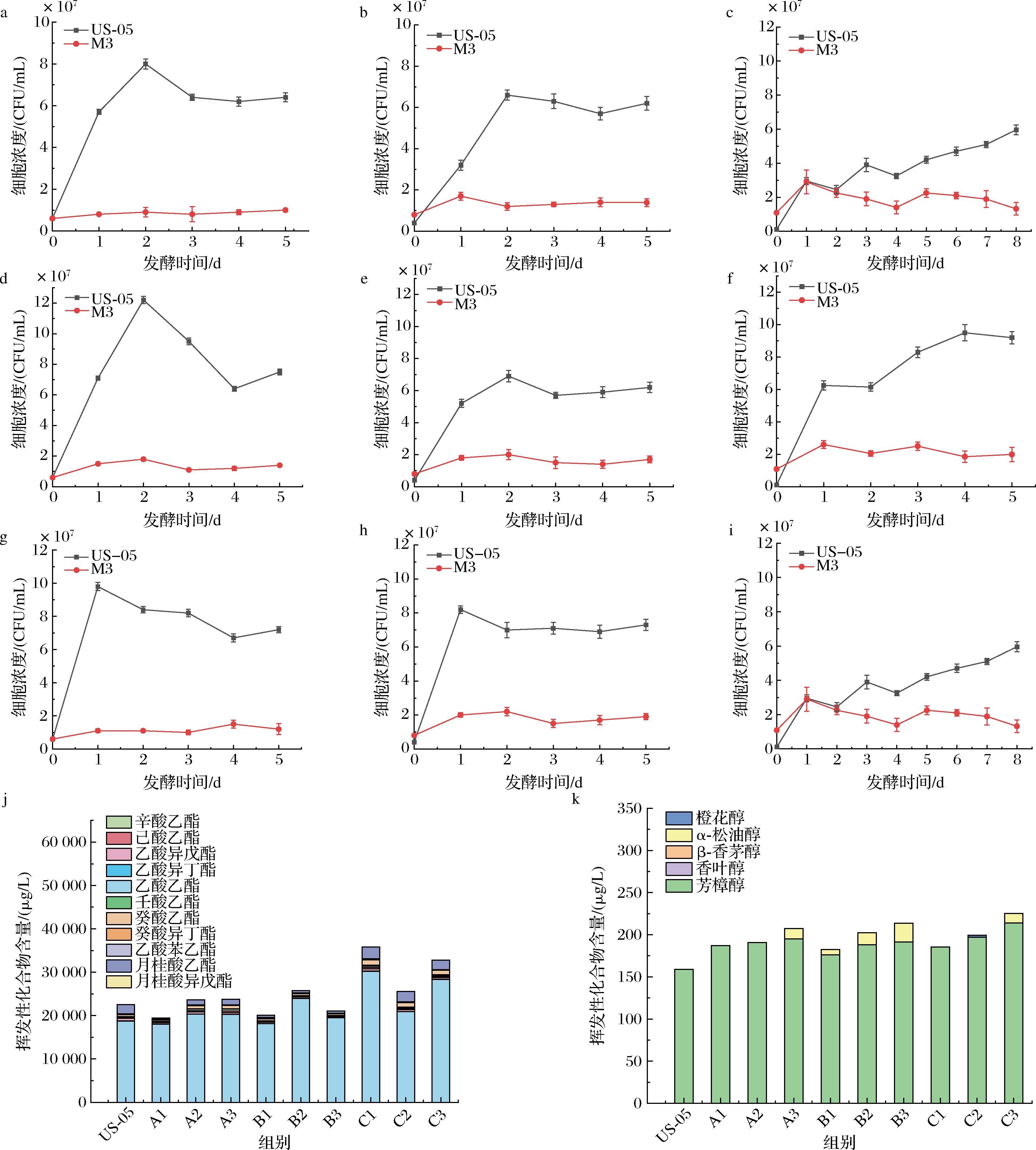 a-A1;b-A2;c-A3;d-B1;e-B2;f-B3;g-C1;h-C2;i-C3;j-酯类化合物含量;k-萜烯类化合物含量
