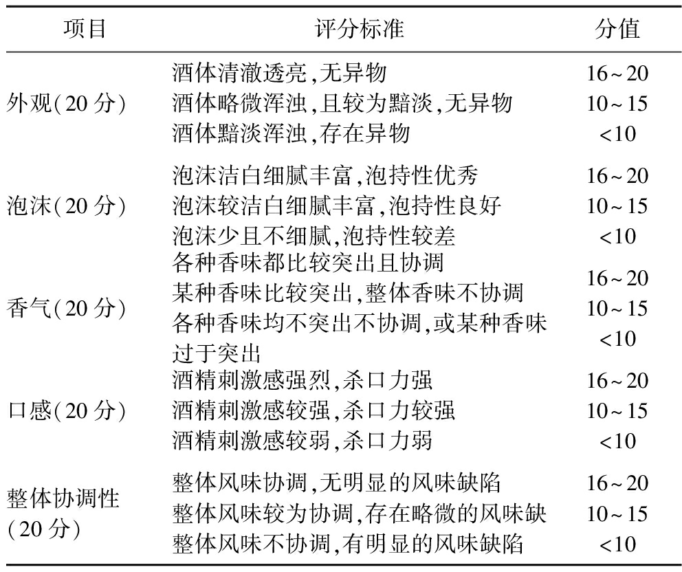项目评分标准分值外观(20分)酒体清澈透亮,无异物酒体略微浑浊,且较为黯淡,无异物酒体黯淡浑浊,存在异物16~2010~15<10泡沫(20分)泡沫洁白细腻丰富,泡持性优秀泡沫较洁白细腻丰富,泡持性良好泡沫少且不细腻,泡持性较差16~2010~15<10香气(20分)各种香味都比较突出且协调某种香味比较突出,整体香味不协调各种香味均不突出不协调,或某种香味过于突出16~2010~15<10口感(20分)酒精刺激感强烈,杀口力强酒精刺激感较强,杀口力较强酒精刺激感较弱,杀口力弱16~2010~15<10整体协调性(20分)整体风味协调,无明显的风味缺陷整体风味较为协调,存在略微的风味缺整体风味不协调,有明显的风味缺陷16~2010~15<10