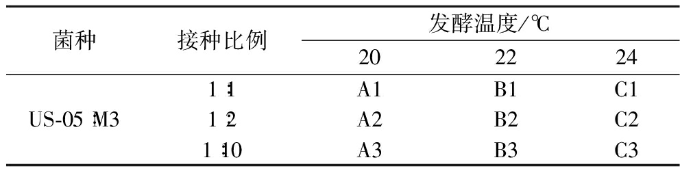 菌种接种比例发酵温度/℃2022241∶1A1B1C1US-05∶M31∶2A2B2C21∶10A3B3C3