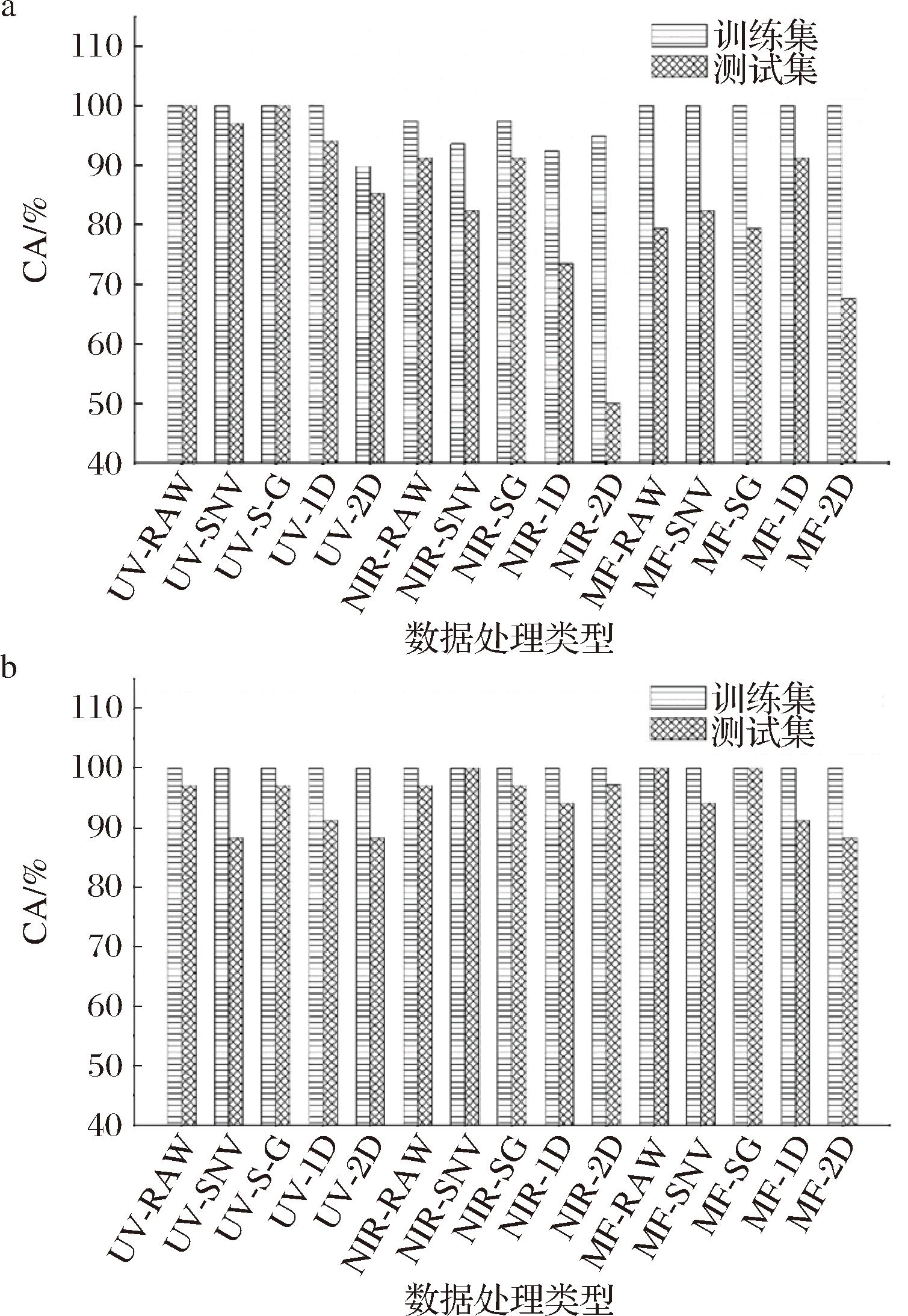 对单一NIR光谱,全光谱或者PCA降维后的数据建立的RF模型均达不到良好的分类识别效果。且经PCA特征提取后的RF模型分类能力低于全谱模型,图9-b中,1D和2D预处理的NIR光谱建立PCA-RF模型的测试集CA为52.94%和47.06%,1D和2D预处理的NIR全光谱建立RF模型的测试集CA值为94.18%和91.18%,可能是因为NIR光谱经过导数处理后需要更多的主成分数才能解释原始光谱信息。总之,通过对单一光谱数据进行PCA特征提取以及MF融合数据建立PCA-RF模型,不仅极大程度的简化模型计算,而且也能从中得到具有较良好分类识别能力的模型。