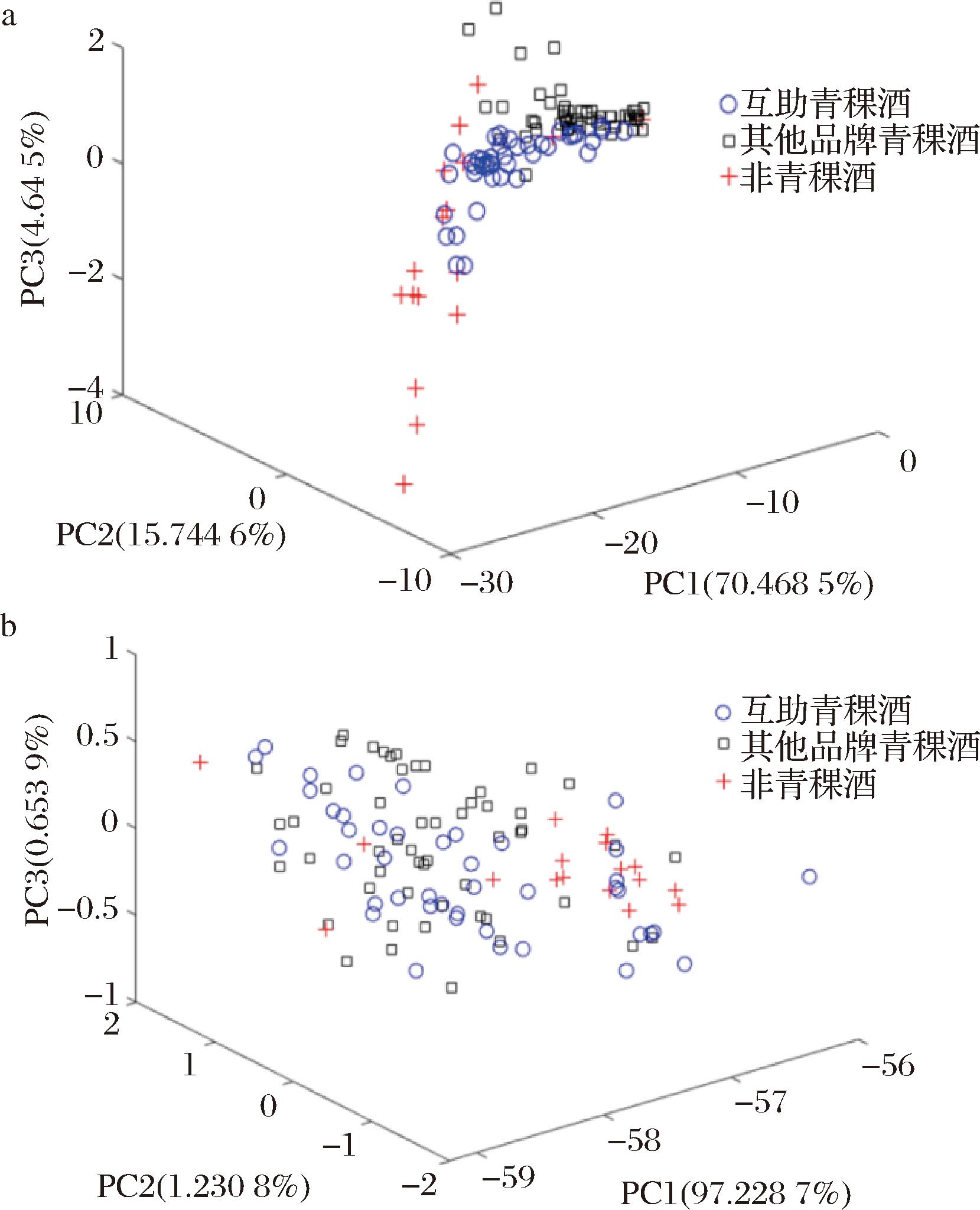 将UV、NIR经SG预处理光谱进行PCA,UV光谱前3个主成分累积方差贡献率达到90.86%,NIR光谱前3个主成分累积方差贡献率达到99.11%,PCA不仅可以数据降维,同样也能对三类样本间的差异进行初步分析。因此,以前3个主成分为变量绘制散点分布图,结果如图4所示。由图4-a可得,“互助”牌青稞酒和非互助牌青稞酒的主成分散点呈聚类趋势,分类较好,但非青稞酒没有明显的簇拥现象;由图4-b可得,三类样本的主成分散点分布互相交叉,类别之间没有明显的簇拥现象。这可能表现在某些方面,三类样本在主成分方向上具有一些相似性,导致它们在这个方向上不能完全分离。UV和NIR光谱进行PCA处理后的前3个主成分不能对目标样本进行正确分类,因此需要采用模式识别方法进一步分析。