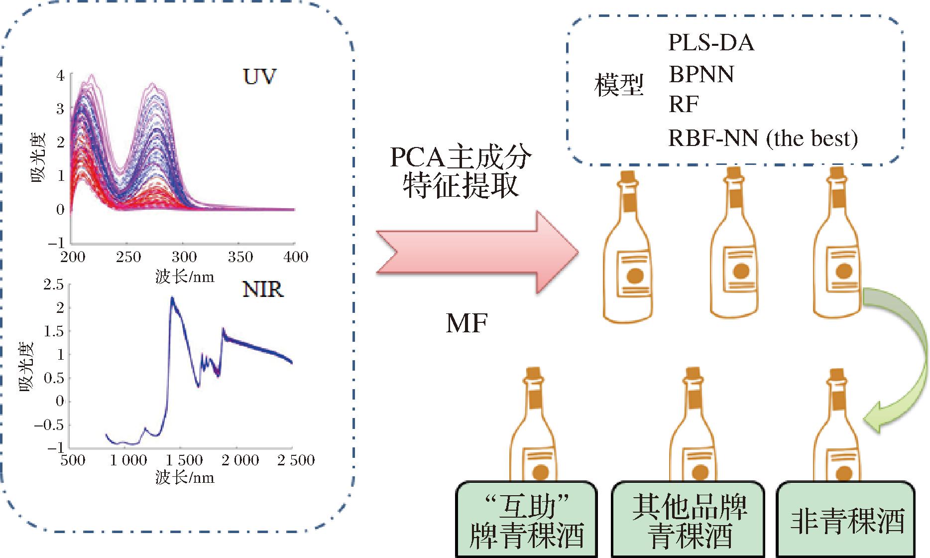 本研究采用4种预处理和主成分特征提取方法对白酒样本的UV和NIR光谱数据进行单独处理和光谱数据融合,基于最佳融合策略建立“互助”青稞酒定性鉴别模型。主要结论如下: