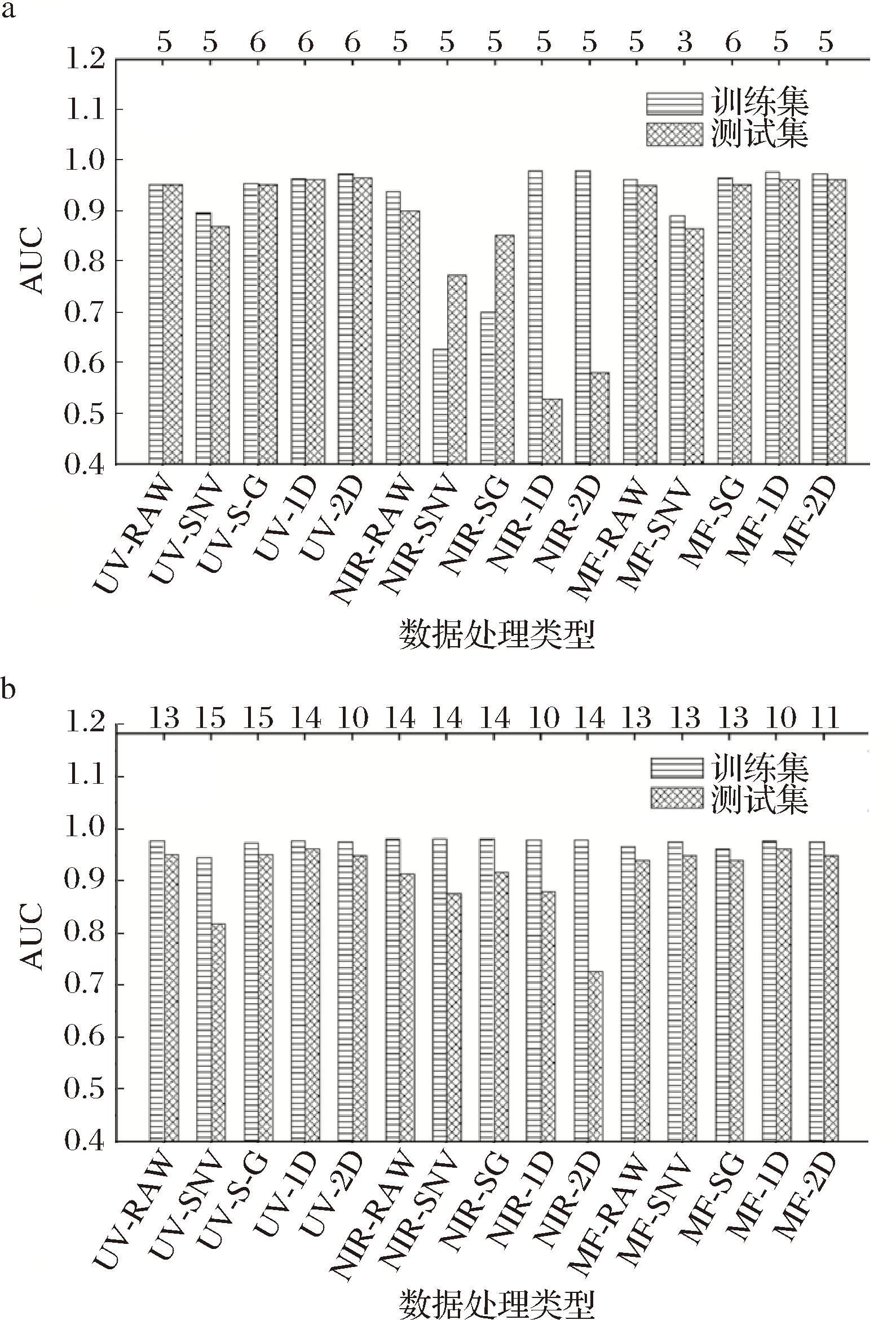 分别考察单光谱数据和融合光谱数据、LF和MF等不同前处理过程对PLS-DA模型的影响。图8-a是对UV、NIR分别经PCA特征提取后的单一光谱数据及其MF数据经不同方法预处理后进行PLS-DA分析的结果;图8-b是未经PCA特征提取,直接对UV、NIR及其LF数据经不同方法预处理后进行PLS-DA分析的结果。