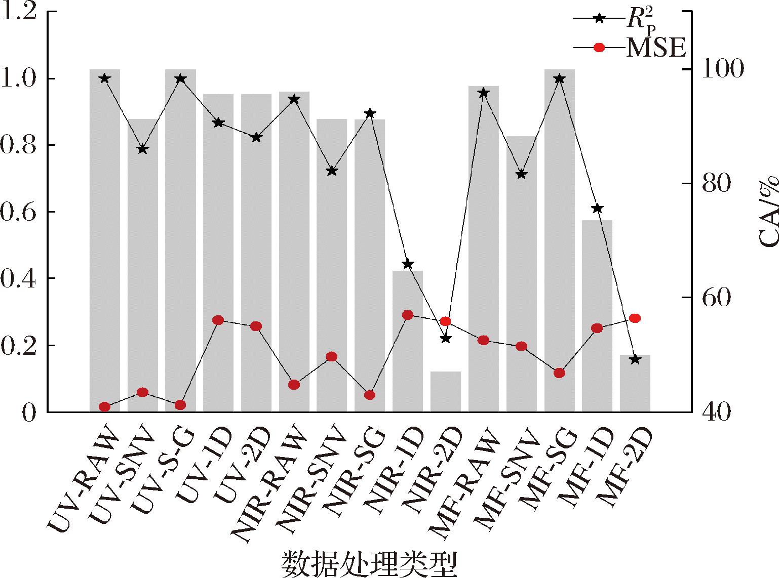 分别为96%和0.938 2,MSE<0.09;基于UV-NIR使用SG处理后的PCA-BPNN模型分类结果最优,预测集CA值和