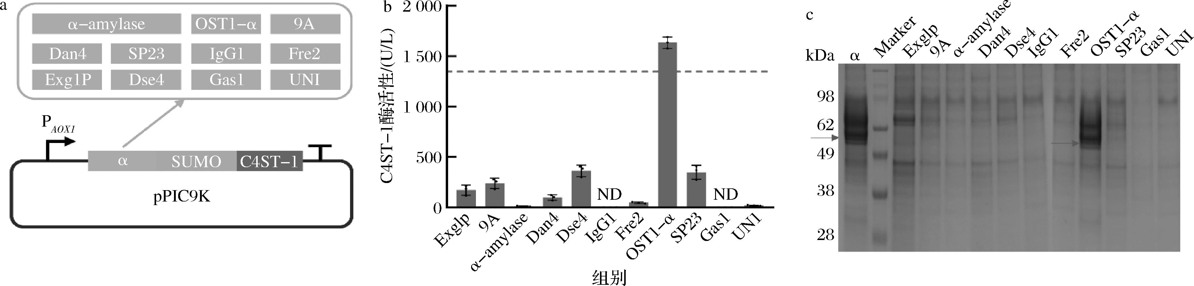 a-信号肽构建示意图;b-酶活性测定;c-SDS-PAGE分析