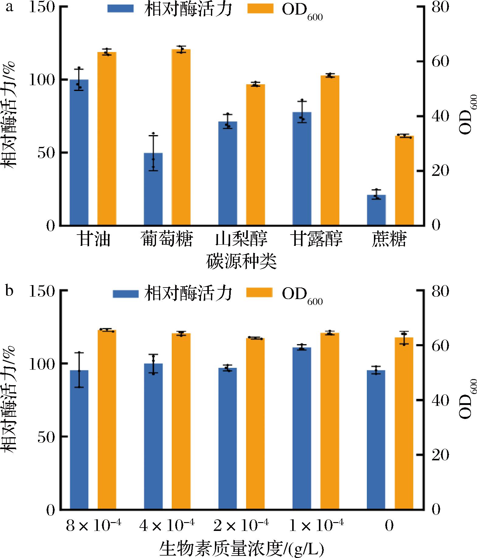 a-不同碳源对菌体生长及C4ST-1酶活性的影响;b-不同生物素质量浓度对菌体生长及C4ST-1酶活力的影响