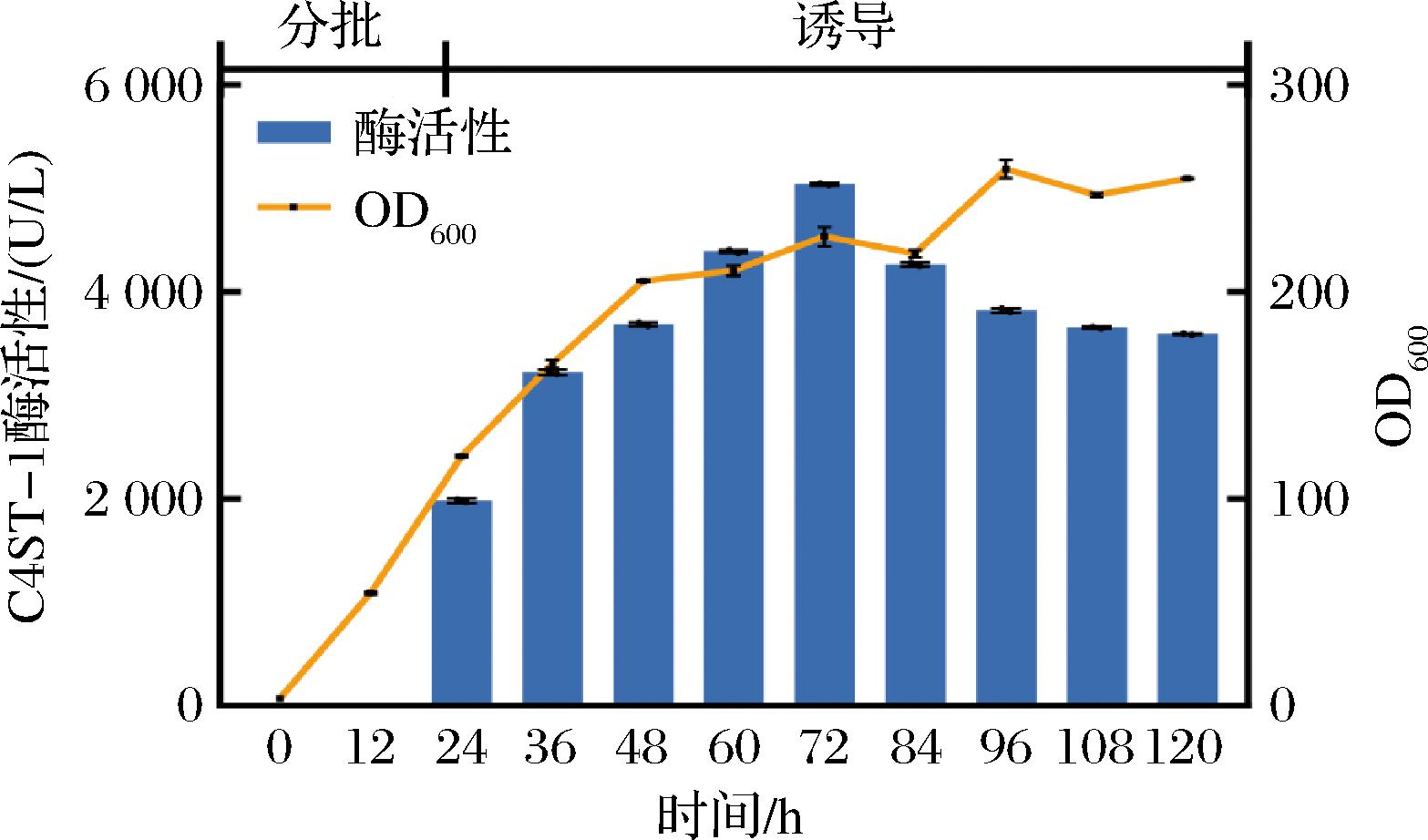 将重组毕赤酵母在YPD平板上30 ℃培养2~3 d,挑取单菌落接种在含有50 mL YPD的250 mL摇瓶中,30 ℃、220 r/min培养24 h作为一级种子液。将一级种子液按10%(体积分数)的转接量转接至含有180 mL YPD的1 L摇瓶中,30 ℃、220 r/min培养24 h作为二级种子液。将二级种子液按照10%的接种量至含有1.8 L BMG改良培养基的5 L发酵罐中。以50%氨水控制pH 6.0,设定初始发酵温度、搅拌转速和通气量分别为30 ℃、200 r/min和2 L/min;随着发酵进行逐步调整转速至500 r/min,发酵过程中将溶氧控制在30%以下。若溶氧量在呈升高趋势且超过60%,则代表罐内甘油耗尽,可以进入甲醇诱导阶段。饥饿培养1 h后,通过逐级添加甲醇流速以及搅拌转速,将溶氧控制在30%以下。整个发酵期间每隔12 h进行取样,测定发酵液OD600和C4ST-1酶活性。