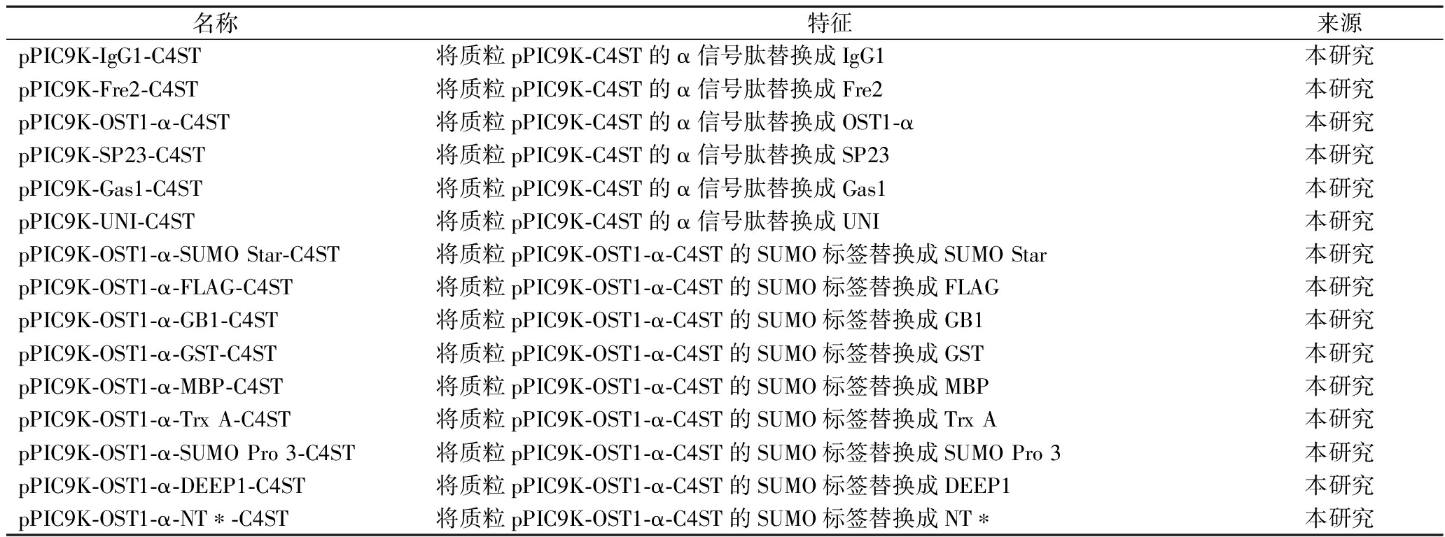 名称特征来源pPIC9K-IgG1-C4ST将质粒pPIC9K-C4ST的α信号肽替换成IgG1本研究pPIC9K-Fre2-C4ST将质粒pPIC9K-C4ST的α信号肽替换成Fre2本研究pPIC9K-OST1-α-C4ST将质粒pPIC9K-C4ST的α信号肽替换成OST1-α本研究pPIC9K-SP23-C4ST将质粒pPIC9K-C4ST的α信号肽替换成SP23本研究pPIC9K-Gas1-C4ST将质粒pPIC9K-C4ST的α信号肽替换成Gas1本研究pPIC9K-UNI-C4ST将质粒pPIC9K-C4ST的α信号肽替换成UNI本研究pPIC9K-OST1-α-SUMO Star-C4ST将质粒pPIC9K-OST1-α-C4ST的SUMO标签替换成SUMO Star本研究pPIC9K-OST1-α-FLAG-C4ST将质粒pPIC9K-OST1-α-C4ST的SUMO标签替换成FLAG本研究pPIC9K-OST1-α-GB1-C4ST将质粒pPIC9K-OST1-α-C4ST的SUMO标签替换成GB1本研究pPIC9K-OST1-α-GST-C4ST将质粒pPIC9K-OST1-α-C4ST的SUMO标签替换成GST本研究pPIC9K-OST1-α-MBP-C4ST将质粒pPIC9K-OST1-α-C4ST的SUMO标签替换成MBP本研究pPIC9K-OST1-α-Trx A-C4ST将质粒pPIC9K-OST1-α-C4ST的SUMO标签替换成Trx A本研究pPIC9K-OST1-α-SUMO Pro 3-C4ST将质粒pPIC9K-OST1-α-C4ST的SUMO标签替换成SUMO Pro 3本研究pPIC9K-OST1-α-DEEP1-C4ST将质粒pPIC9K-OST1-α-C4ST的SUMO标签替换成DEEP1本研究pPIC9K-OST1-α-NT∗-C4ST将质粒pPIC9K-OST1-α-C4ST的SUMO标签替换成NT∗本研究