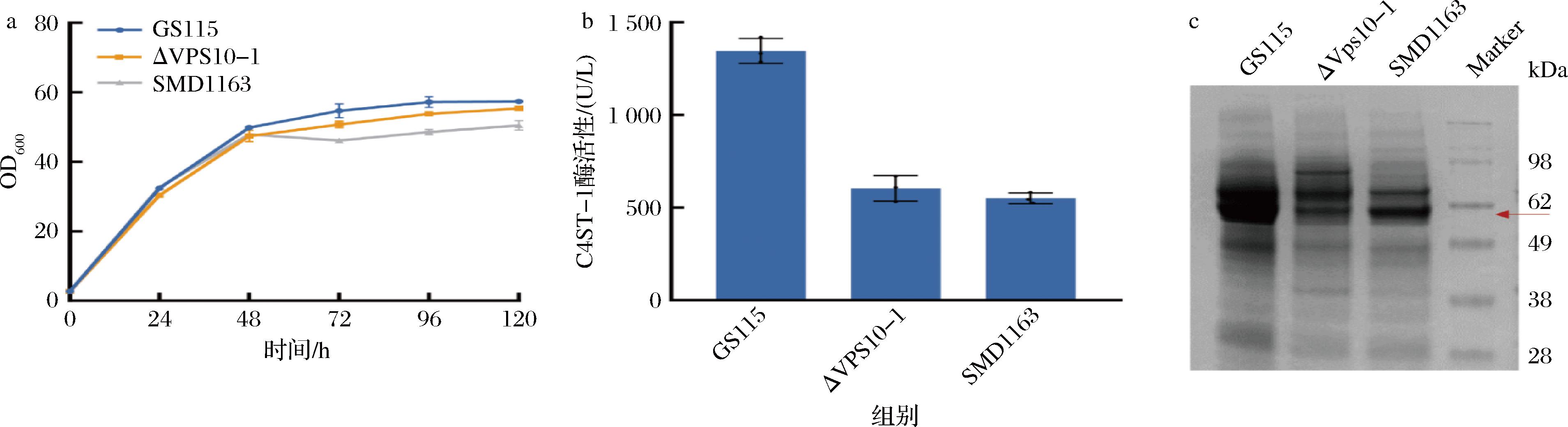 毕赤酵母已成为常用的真核生物表达系统之一,其优越的翻译后修饰能力、强而严格的启动子、简便的培养条件,使其在分泌表达外源蛋白方面具有显著优势[12]。不同的毕赤酵母底盘细胞的甲醇利用能力、基因型、分泌能力以及工业生产特性均有所差异[12-14]。为此,对比了GS115、ΔVPS10-1和SMD1163 3种毕赤酵母底盘细胞对C4ST-1的表达能力。GS115是一种广泛应用于重组蛋白表达的经典毕赤酵母底盘细胞,凭借着其高效的诱导表达能力及良好的工业发酵适应性,正逐渐成为工业规模化生产的重要菌种[12]。ΔVPS10-1是基于GS115株,通过敲除液泡分选受体蛋白Vps10的结构域Ⅰ来降低液泡的错误分选[13];而SMD1163则在GS115的基础上通过突变pep4和prb1基因,导致蛋白水解酶A和蛋白水解酶B活性的丧失,从而保护外源蛋白免受降解[14]。将C4ST-1转入3种毕赤酵母底盘细胞,结果见图1。在0~24 h重组菌GS115、ΔVPS10-1和SMD1163的OD600基本一致。在甲醇诱导(24 h)开始后,随着培养时间的延长,重组菌GS115的OD600逐渐高于另外2株重组底盘细胞,这可能是由于基因敲除对细胞甲醇耐受性的影响,从而限制了菌体的生长。通过测定C4ST-1酶活性发现重组菌GS115酶活性明显高于另外2株重组菌,且经SDS-PAGE分析显示重组菌GS115条带较粗。因此,选择毕赤酵母GS115作为后续研究的底盘细胞。