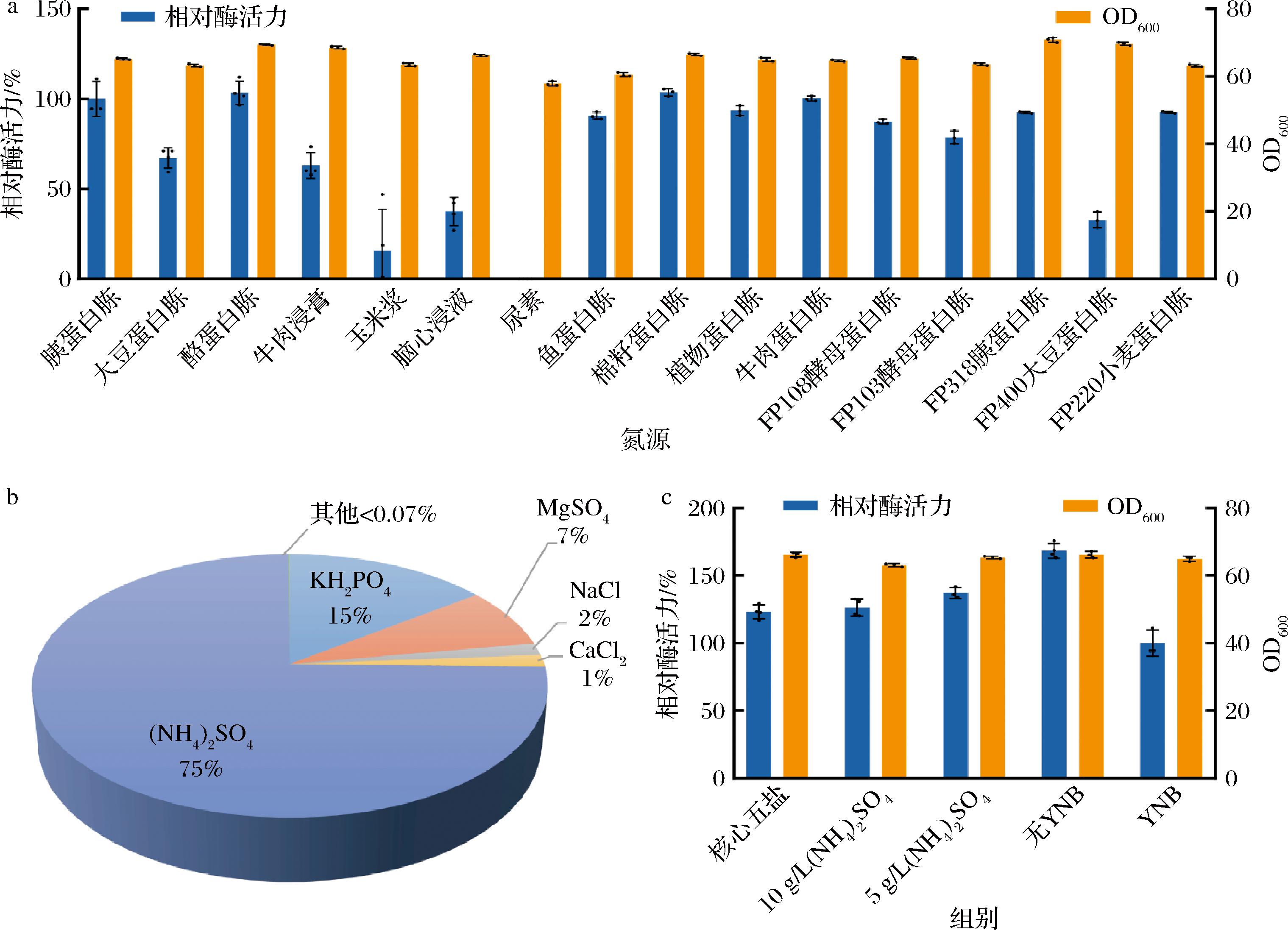 a-不同氮源对菌体生长及C4ST-1酶活性的影响;b-YNB组分分析;c-YNB组分对菌体生长及C4ST-1酶活性的影响