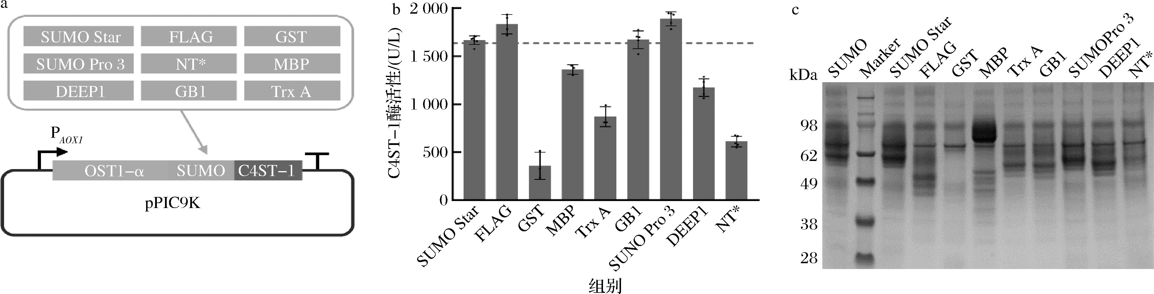 a-促溶标签构建示意图;b-酶活性测定;c-SDS-PAGE分析