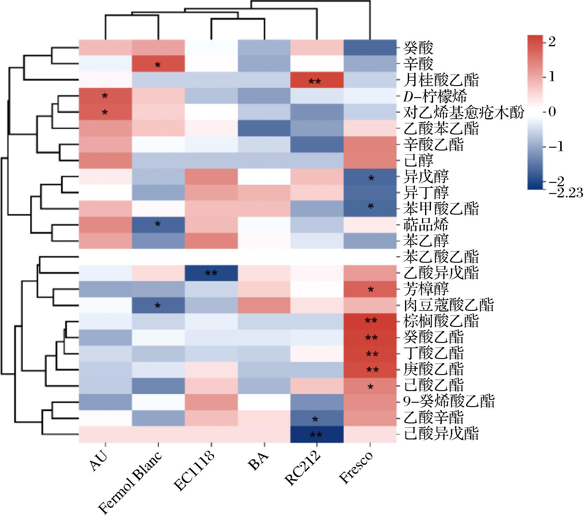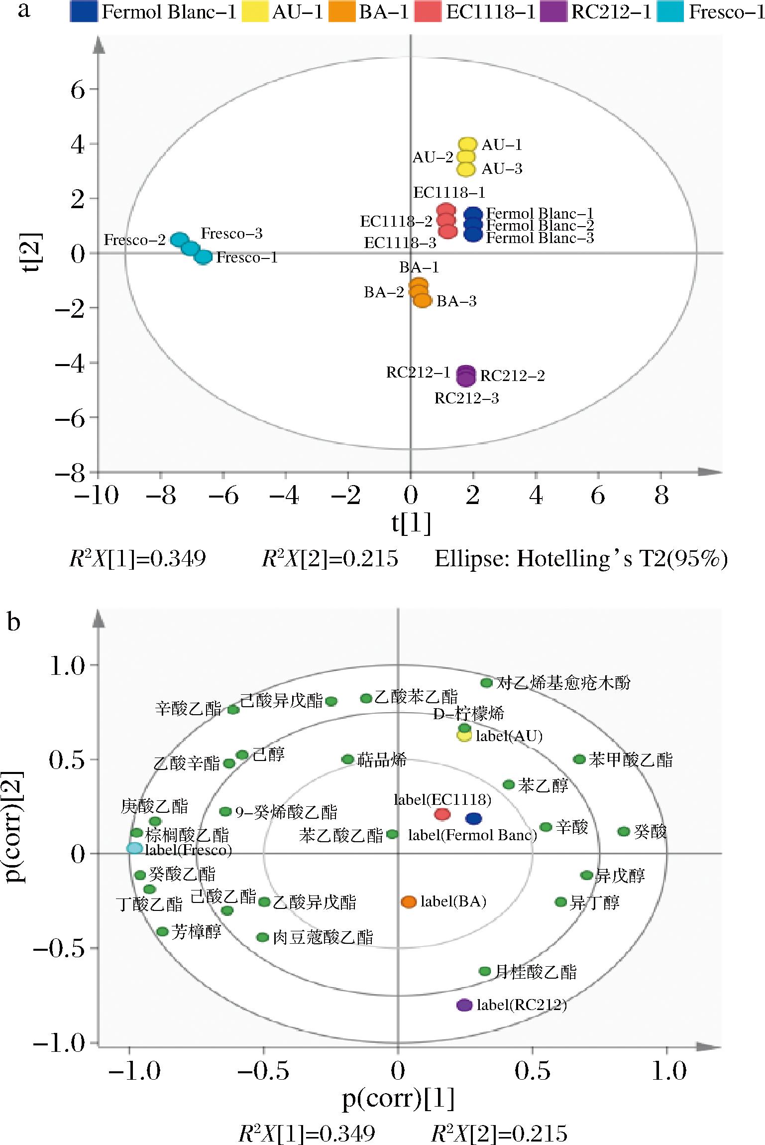 橘子酒中挥发性成分复杂,采用PCA法,进一步分析不同酿酒酵母发酵橘子酒的挥发性成分差异。根据PCA结果,PC1贡献率为34.9%,PC2贡献率为21.5%,总贡献率为56.4%,大于50%,较好地概括了样本差异。由得分图(图5-a)可知,Fresco样本点分布与PC1的负半轴,而AU、BA、EC1118、RC212和Fermal Blanc的样本点分布于PC1的正半轴。这表明Fresco与其他样本之间在挥发性成分的分布中存在显著差异。根据载荷图(图5-b)分析可知,棕榈酸乙酯(温和的蜡状甜味、奶油味)、癸酸乙酯(水果,白兰地香气)、丁酸乙酯(酸甜味、果味)等物质在Fresco样本中贡献较大,反映了Fresco菌株优越的产酯能力;D-柠檬烯在AU样本中贡献最大为显著,彰显了AU菌株的原料柑橘特征保留能力;而月桂酸乙酯对RC212型样本贡献度最高。