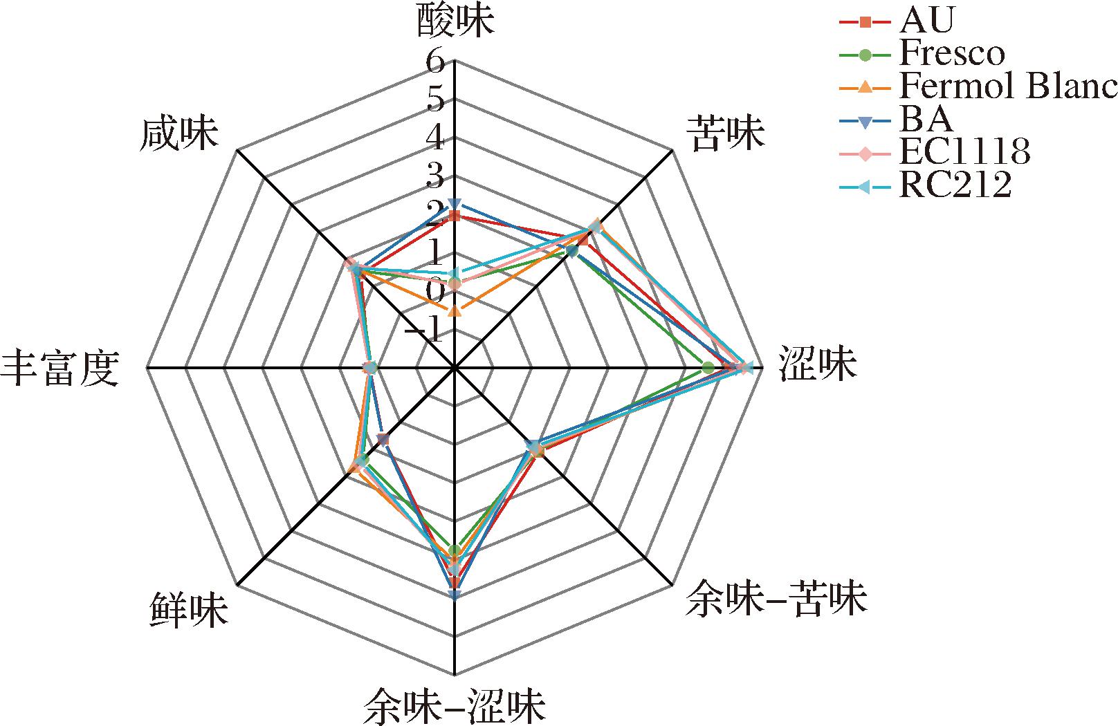 利用电子舌对不同的橘子酒样品进行客观的模拟味觉分析,根据电子舌响应值绘制雷达图,结果如图6所示。AU和BA型酵母发酵的橘子酒在酸味上显著高于其他菌株发酵的橘子酒。Fermol Blanc和RC212型酵母发酵的橘子酒呈有强苦味和涩味的特征。EC1118和Fresco型酵母发酵的酸味较为适中,其中Fresco型酵母发酵的橘子酒苦涩味较低。此外,在后苦方面,BA型酵母发酵的橘子酒后苦感最为突出,而Fresco型酵母发酵的橘子酒后苦感最弱。