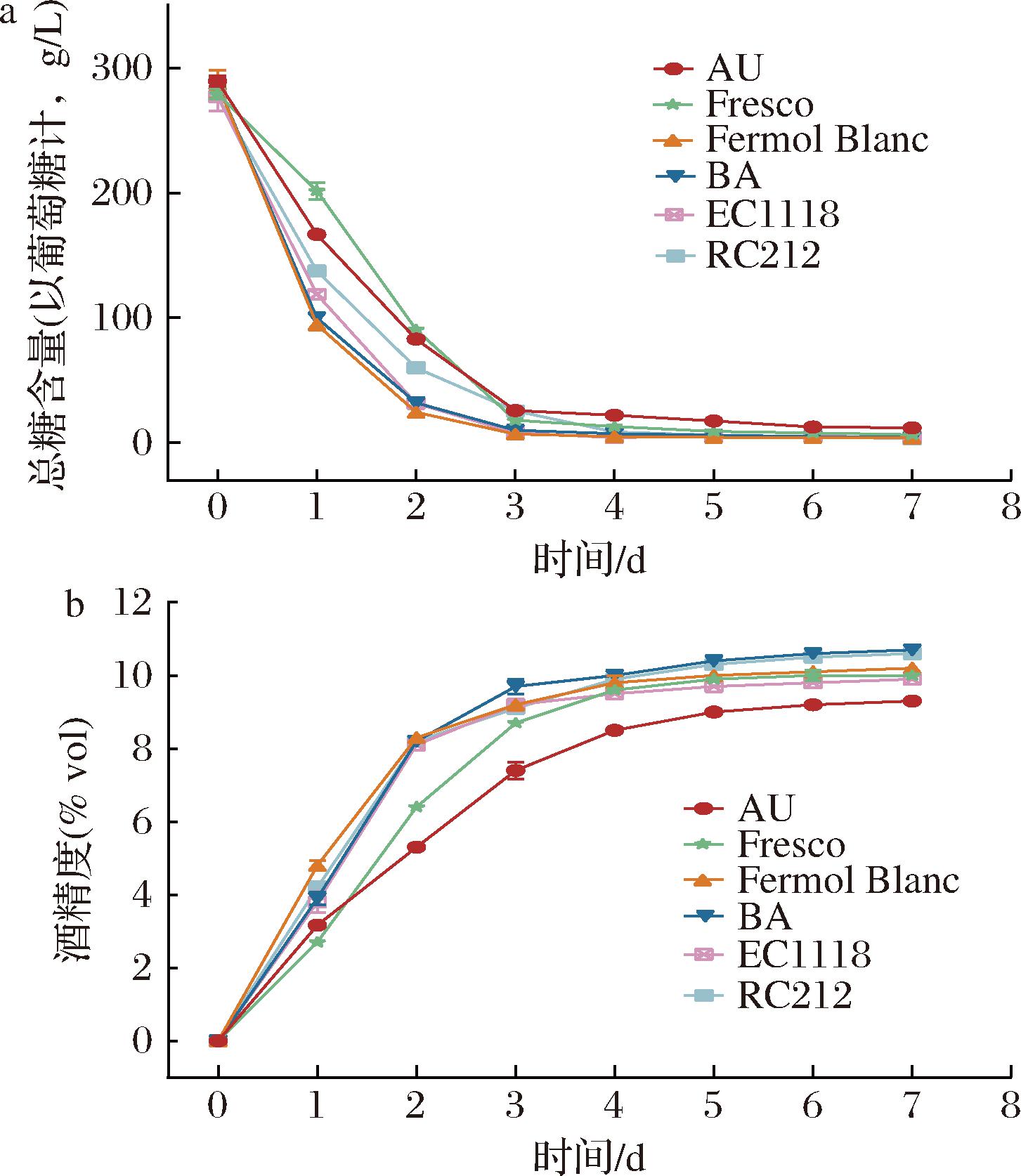 因此,本研究选取6种酿酒酵母(AU、BA、EC1118、RC212、Fermol Blanc、Fresco),系统分析其发酵橘子酒过程中理化指标(总糖、乙醇、总酸度)动态变化,结合顶空固相微萃取-气质联用(headspace solid phase micro extraction-gas chromatography-mass spectrometer, HS-SPME-GC-MS)技术解析挥发性成分差异,通过气味活性值(odorant activity value,OAV)和主成分分析(principal component analysis,PCA)评估特征香气贡献,采用电子舌对苦味、酸味等味觉特征进行客观量化评价,以及人工感官评价对整体风味协调性进行综合考量,实现从化学组成、味觉特征到整体感官体验的多维度解析,系统探究不同酿酒酵母菌株对橘子酒品质的影响机制,旨在筛选出适配橘子酒发酵、兼具特征风味与口感平衡的优势菌株,为提升橘子酒品质提供理论依据,推动柑橘深加工产业多元化发展。