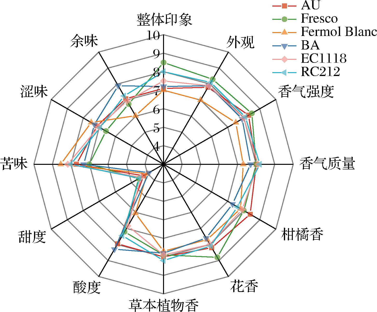 由图7所示,Fresco样本在香气强度(8.5±0.3)与整体印象(8.5±0.2)方面显著高于其他样本,带有明显的花香和果香,可能与其挥发性成分中辛酸乙酯(OAV=27.72)和癸酸乙酯(OAV=5.7)的梨/荔枝果香协同效应密切相关。此外,Fresco样本的酸味适中,苦涩感较弱,口感较为平衡。然而,AU和BA型酵母发酵的橘子酒在酸味上较强,且涩味较为显著。Fermol Blanc型酵母发酵的橘子酒酸味明显低于其他橘子酒,但是其苦涩味较为突出,影响了整体口感的平衡。EC1118型酵母发酵的橘子酒则在草本香和果香方面表现较好,但稍显苦味,整体口感较为复杂。