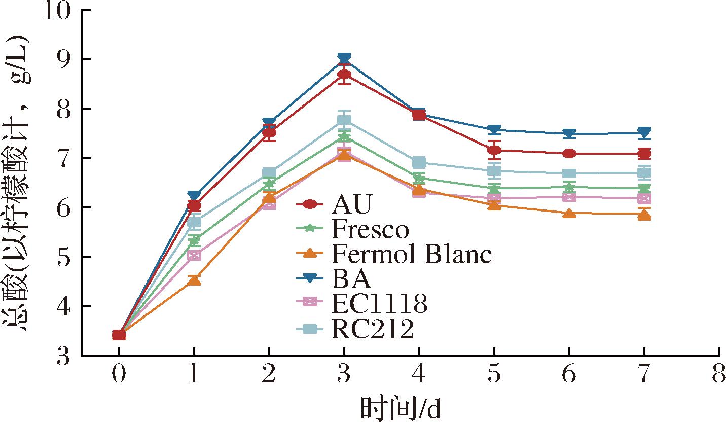总酸度是衡量橘子酒发酵过程稳定性的一个重要指标[22]。对于橘子酒而言,适当的酸度能带来清爽的口感,使得酒体更加平衡。如果酸度过高,可能会使酒的味道过于尖锐或酸涩,失去其应有的果香[22]。发酵过程中总酸度的变化情况如图2 所示,在发酵前期(0~3 d),6种酵母菌株均呈现出总酸快速积累的趋势,增幅达到 3.64~5.57 g/L,并于第3天达到峰值。其中,AU和 BA菌株发酵产生的总酸度峰值最高,分别为(8.70±0.20) g/L和(8.99±0.12) g/L。此阶段总酸度的普遍升高可能与酵母糖酵解过程中有机酸(如琥珀酸、丙酮酸等)的中间产物积累有关[12,22],SONG等[23]和LEE等[24]研究表明在发酵过程中可滴定酸度增加的最大部分的有机酸是琥珀酸[23],同时酵母在酒精发酵过程中,丙酮酸脱氢酶活性会受到一定抑制,丙酮酸向乙酰辅酶 A 的转化受阻,导致丙酮酸积累[25]。随后这些有机酸经历了进一步的代谢过程,最终含量保持稳定。由图2可知,不同酿酒酵母酿造橘子酒的总酸度有明显区别,BA型酵母发酵的橘子酒的最终总酸度最高(7.50±0.11) g/L,而Fermol Blanc型的最终总酸度最低(5.88±0.11) g/L,暗示菌株有机酸代谢路径差异可能会影响酒体的酸度平衡。EC1118、RC212、AU和Fresco型酵母发酵的橘子酒总酸度分别为(6.18±0.11)、(6.70±0.14)、(7.10±0.14) g/L和(6.35±0.07) g/L。