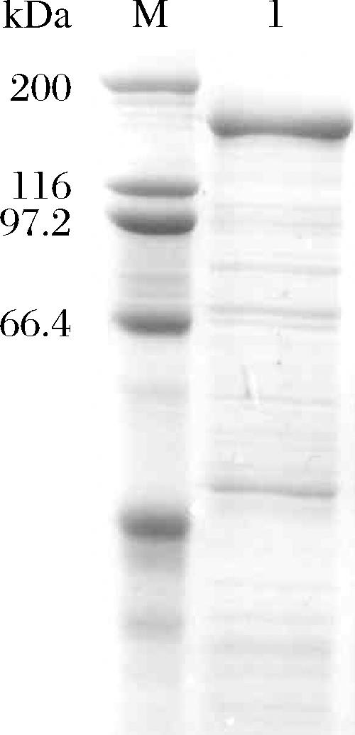 将重组质粒pET24a(+)-cggde转入E.coli BL21(DE3)感受态细胞,获得重组菌,经摇瓶发酵培养后离心收集上清液,测得上清液中CgGDE酶活力为69.3 U/mL。然后将上清液进行SDS-PAGE分析,如图1所示,在170 kDa左右有明显条带,与重组CgGDE的分子质量大小一致,表明重组CgGDE在大肠杆菌中成功表达。