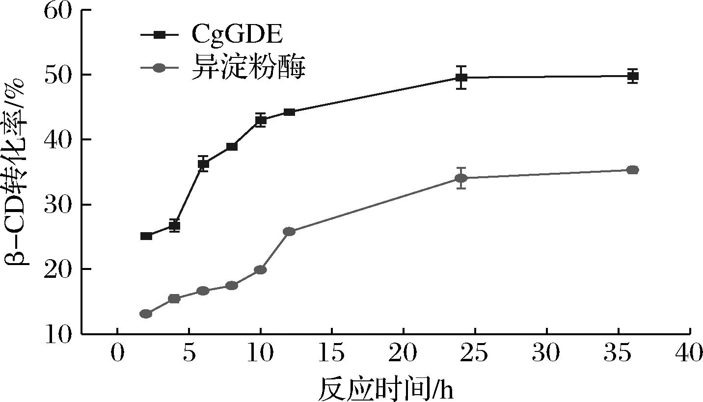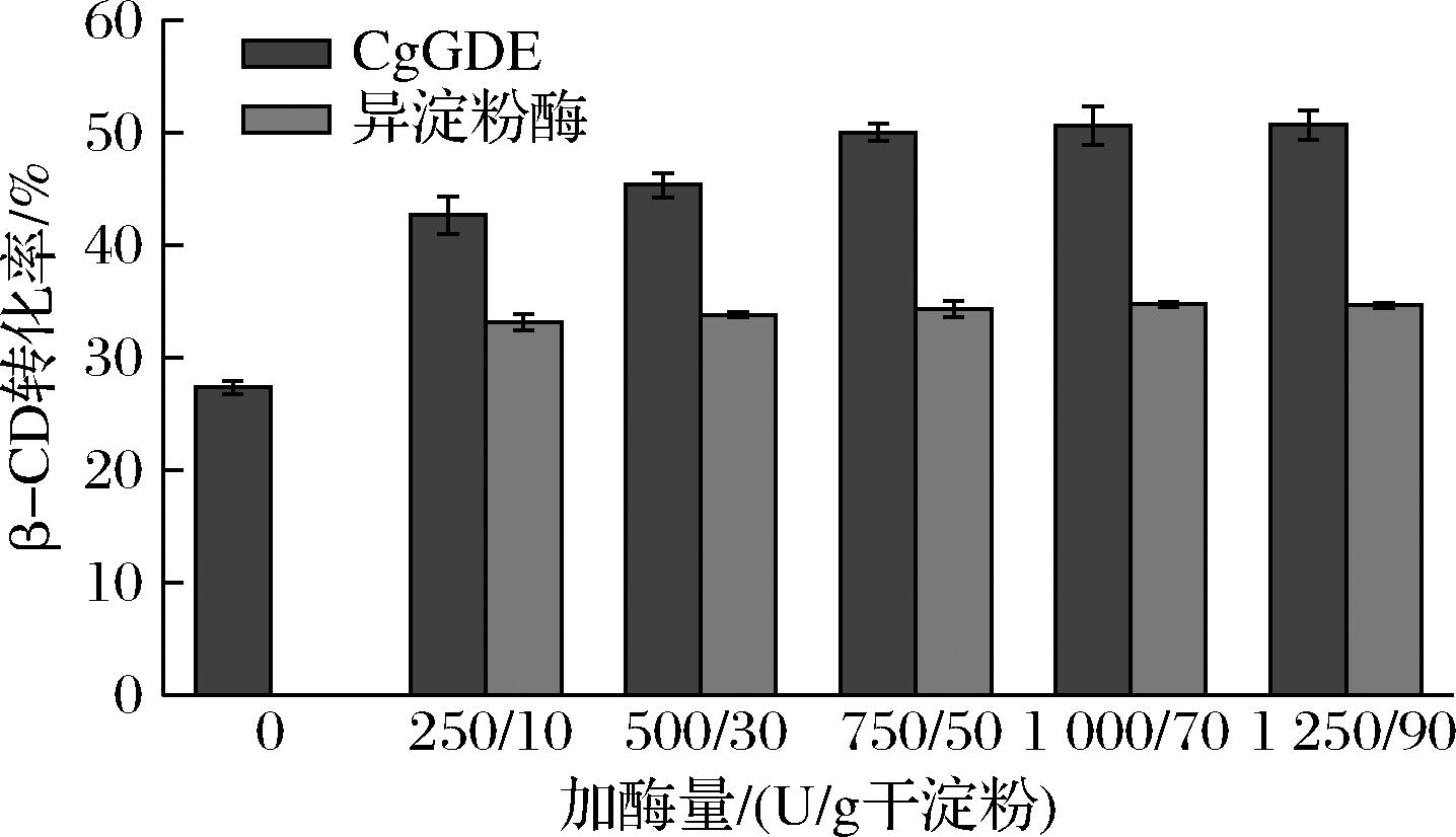 为探究多功能脱支酶在CD制备中的应用,本研究将β-CGTase分别与CgGDE和异淀粉酶进行复配,以体现GDE在β-CD制备中的优势。
