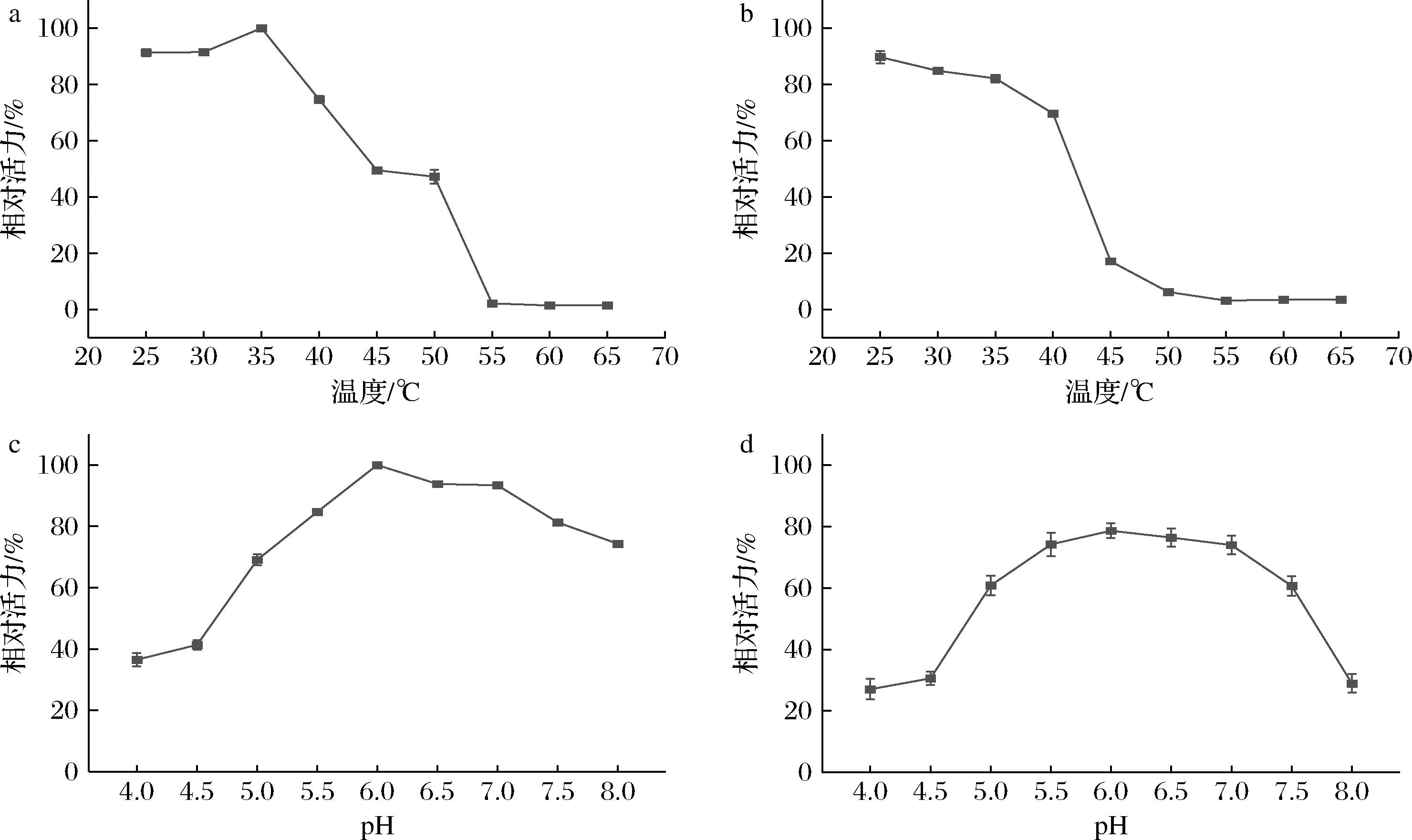 a-最适温度;b-温度稳定性;c-最适pH;d-pH稳定性