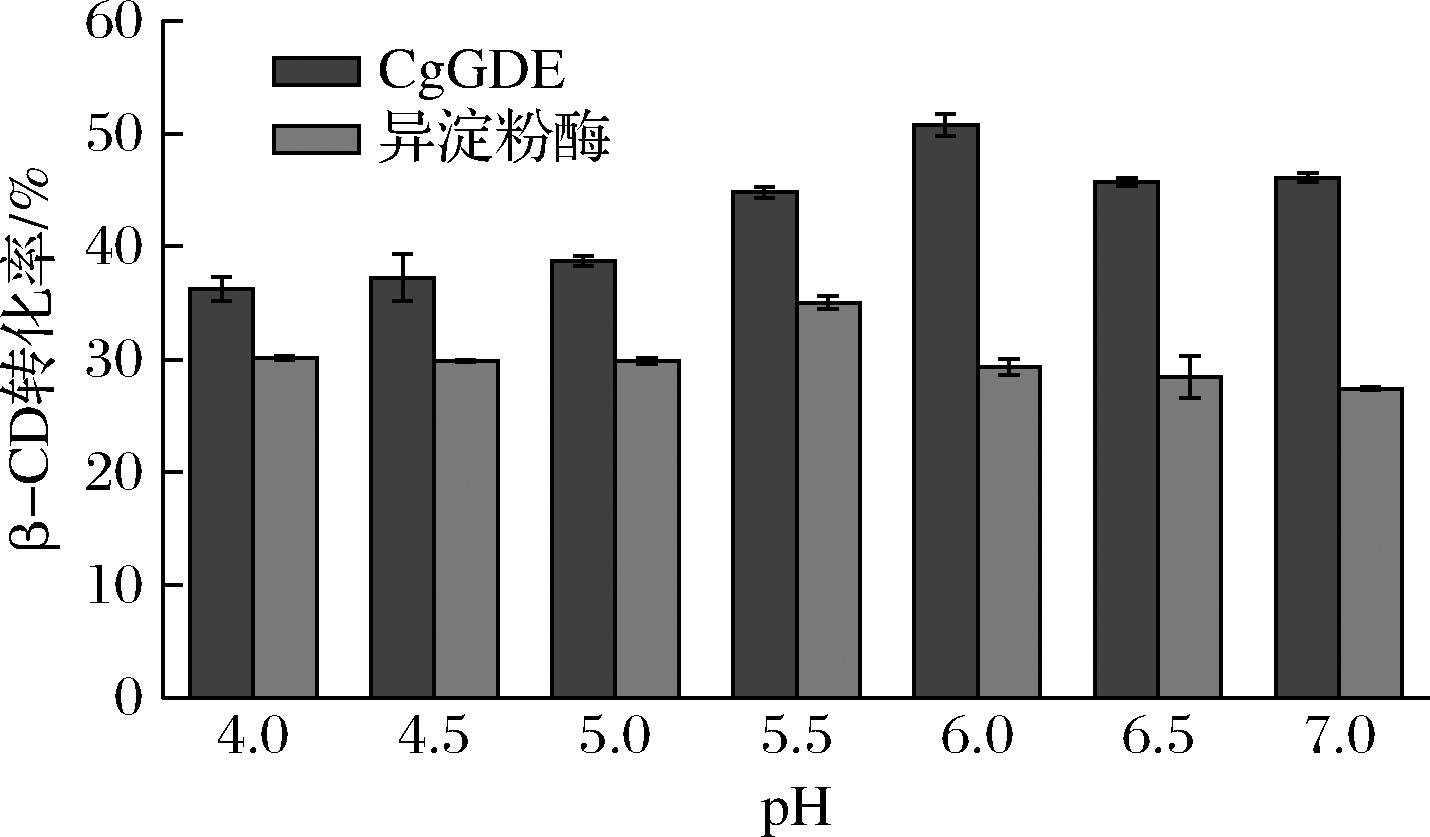 pH对酶的稳定性有很大影响,过高或过低pH都会改变酶活力中心的构象,使酶活力下降甚至失活[11],影响转化率。为考察制备β-CD的最适pH,分别在pH 4.0~7.0进行酶转化反应,保持其他条件不变。如图6所示,CgGDE在pH值为6.0时,β-CD转化率最高,为50.8%,高于其他pH条件下的转化率,且在pH 5.5~7.0,CD转化率均在40%以上,这主要是因为在上述pH范围内,CgGDE的活力较高;而当pH<5.5时,转化率较低。因此,将酶转化pH值定为6.0。而异淀粉酶在最适转化pH 5.5下的转化率仅为35.0%。