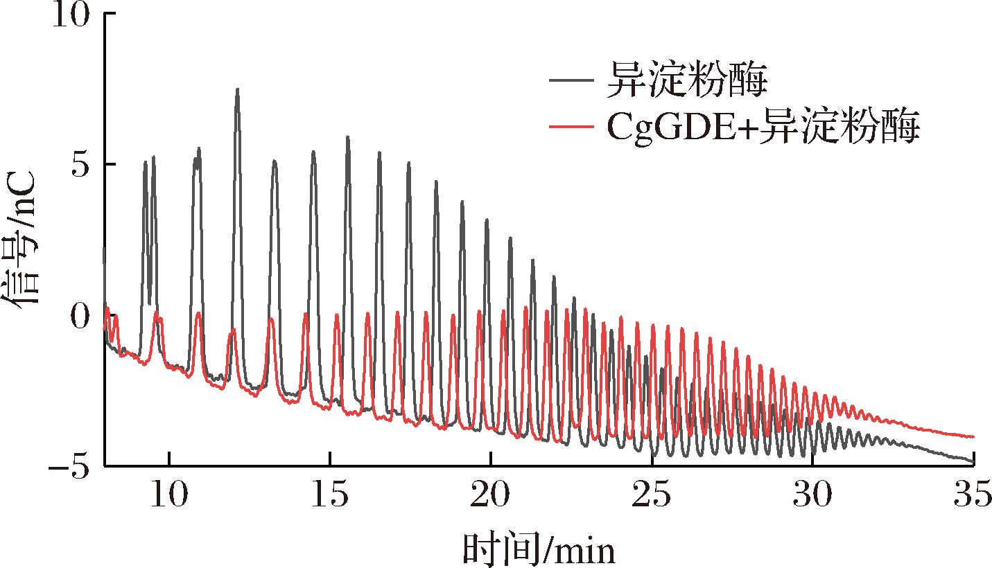 为了验证GDE能否在一定程度上延长糖链,将经GDE处理和未处理的淀粉产物同时脱支后进行聚合度的对比,结果显示,添加GDE的样品高聚合度产物的含量明显增多(图8),表明GDE可以有效延长淀粉链。GDE酶与异淀粉酶相比,更能提升β-CGTase的CD转化率,可能是因为长糖链较短糖链更利于CD合成。