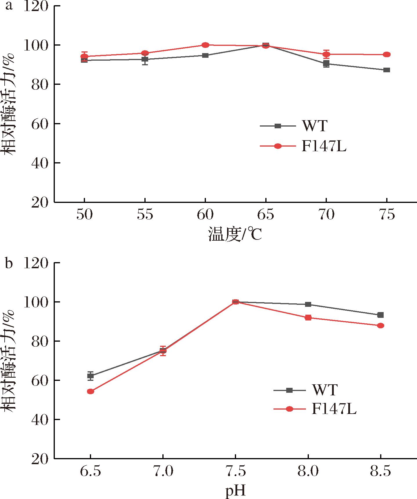 按照1.3.3.3节的方法对WT和突变体F147L进行了最适温度和最适pH的测定,并绘制了相对酶活力-温度和相对酶活力-pH曲线。如图3-a和图3-b所示,发现WT的最适温度为65 ℃,突变体F147L的最适温度为60 ℃;而WT和突变体F147L的最适pH均为7.5。