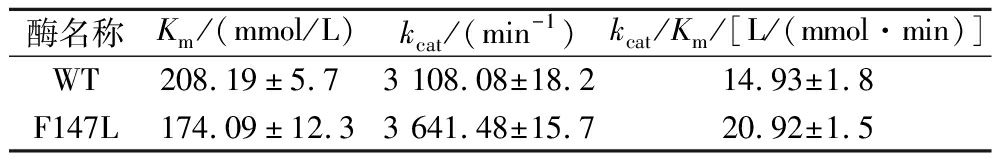 为了进一步表征突变体的催化活力变化,通过测定不同底物浓度下的酶活力,在数据处理时拟合Michaelis-Menten方程得到了CcDAE WT和F147L的动力学参数,结果见表3。和WT相比,F147L对底物的亲和力提升,Km值为174.09 mmol/L;与此同时F147L的kcat值为3 641.48 min-1,高于WT,证实突变体F147L的催化效率得到了提升。