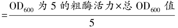 挑取单菌落或从甘油管中取20 μL接种至10 mL含相应抗生素的LB培养基中,在37 ℃、200 r/min下过夜培养10~12 h,然后取2.5 mL上述菌液转接至50 mL含相应抗生素TB发酵培养基中,在37 ℃、200 r/min下培养1.5~2 h后,加入诱导剂(0.2 μg/mL Tet),随后将发酵液转移至25 ℃,200 r/min下继续发酵24 h。结束发酵的发酵液,取适量菌液离心获得菌体,使用HEPES缓冲液重悬菌体,获得OD600为5的重悬液,然后通过高压匀浆机破碎细胞,再次离心并分离破壁上清液,该破壁上清液为粗酶液,计算如公式(1)所示: