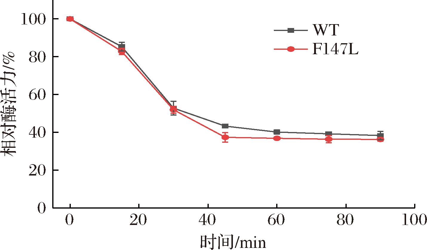 分别在WT和突变体F147L的最适温度下比较二者的比活力,如表2所示,在60 ℃和65 ℃下,突变体F147L的比活力分别比WT提高了26.21%和19.03%,均表现出了明显的比活力提高。