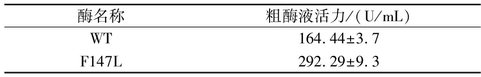 酶名称粗酶液活力/(U/mL)WT164.44±3.7F147L292.29±9.3