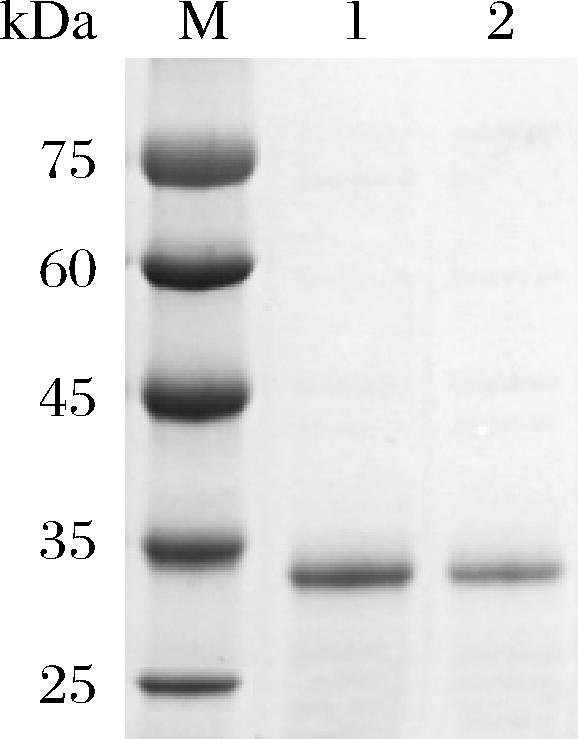 M-Marker;1-DAE WT纯化蛋白;2-F147L纯化蛋白。