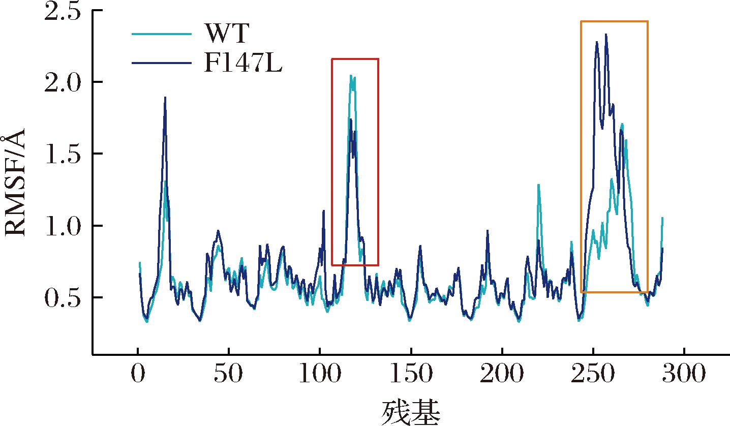 为解析优势突变体的构效关系,对其进行分子动力学分析。RMSF值表示的是一定时间内蛋白结构中各原子相对于平均位置的变化幅度,即原子灵活度,在一定程度上可以表征蛋白质稳定性的变化[21]。如图5所示,可以发现WT的α4-β4间的loop区域上111~121位残基(红框内)RMSF值较高,说明该区域具有较大的柔性,而F147L的引入赋予了该区域更强的刚性,同时也给246~261位残基区域(橙框内)带来了更大的波动,使该区域柔性增大。