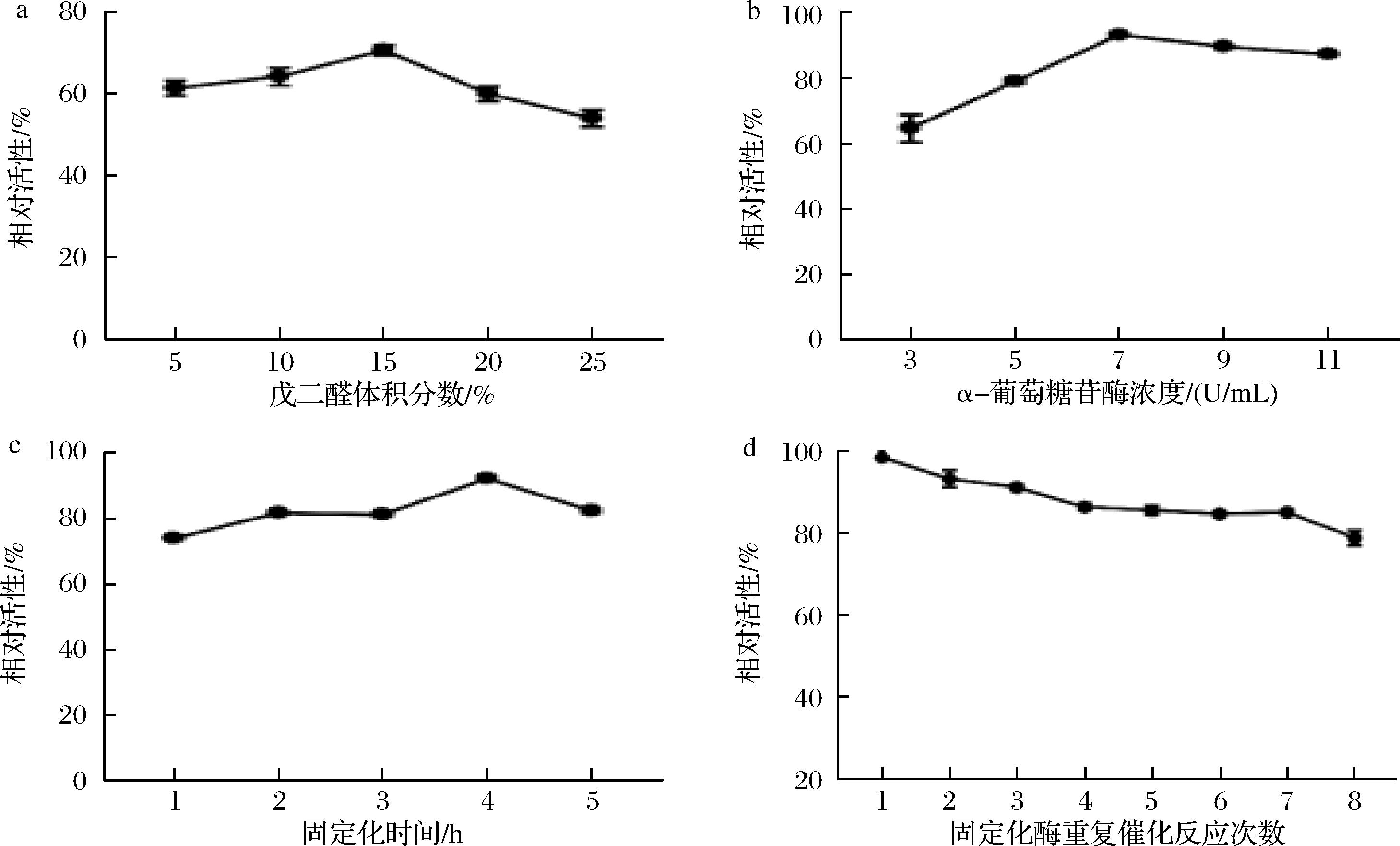 a-戊二醛浓度;b-α-葡萄糖苷酶浓度;c-固定化时间对固定化酶相对活性的影响;d-固定化酶重复催化反应8次